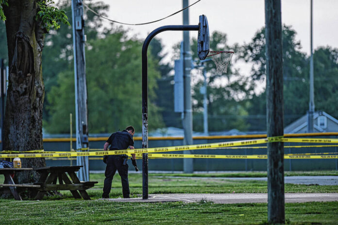 Mike Wolanin | The Republic A Columbus police officer searches for evidence after four people were shot on the basketball court at Lincoln Park in Columbus, Ind., Tuesday, May 23, 2023.