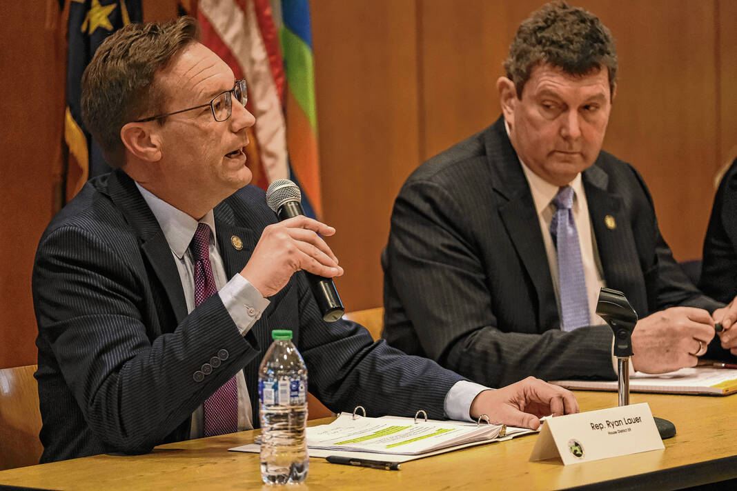 Mike Wolanin | The Republic State Reps. Ryan Lauer, left, and Jim Lucas take part in a Legislative Preview Lunch organized by the Columbus Area Chamber of Commerce at Columbus City Hall in Columbus, Ind., Monday, Dec. 11, 2023. The legislators discussed issues facing the state and what they hope to accomplish in the upcoming short legislative session.