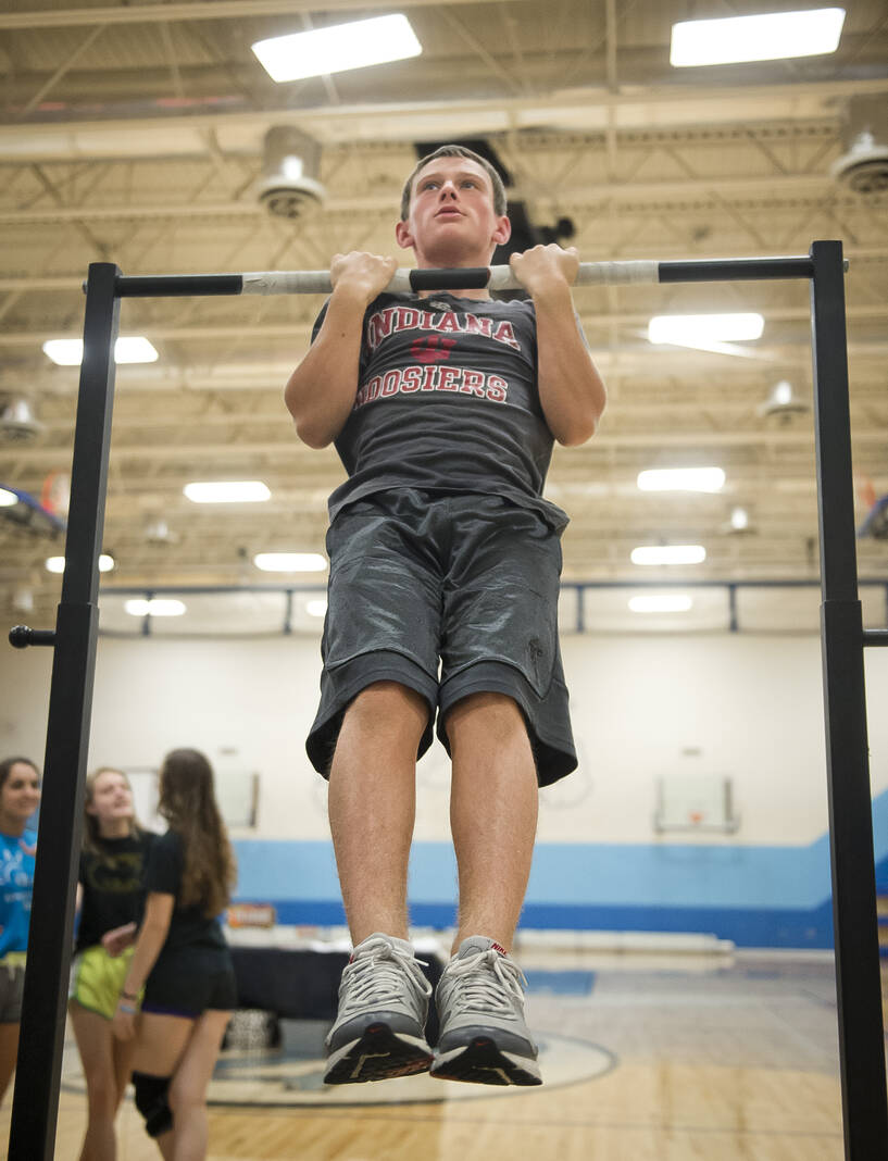 North student Kaleb Etter does a pullup during the Great American Rivalry Fitness Challenge program on Aug. 26, 2015, at Columbus North High School.
