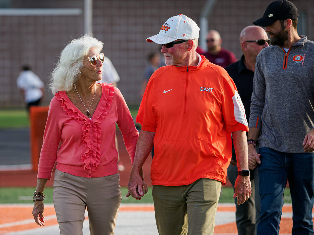 Former East and Hall of Fame coach Bob Gaddis was honored with a video tribute. Gaddis stood at center of the field along with his family and East administration as the stadium was named in his honor.