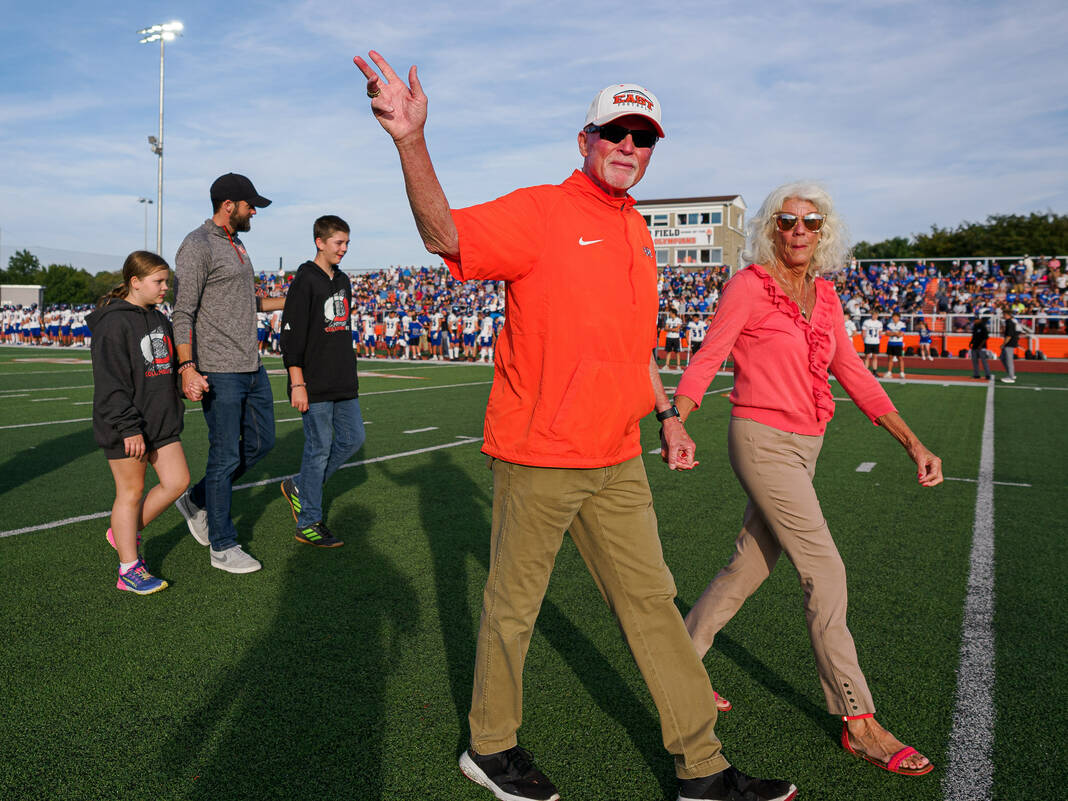 Former Columbus East football coach Bob Gaddis holds hands with his wife Karen as he waves to Columbus East fans during a ceremony to name the Columbus East High School football stadium, Bob Gaddis Stadium at Columbus East High School in Columbus, Ind., Friday, Aug. 29, 2025. Gaddis is the winningest coach in the history of Columbus East football program.