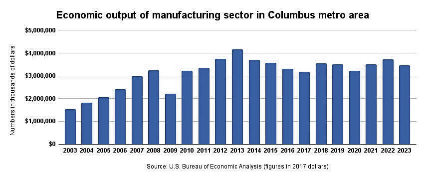 The data shows that the economic output of durable goods manufacturing in the Columbus metro area, when accounting for inflation, soared over 206% from 2003 to 2013 but declined 19% from 2013 to 2023.