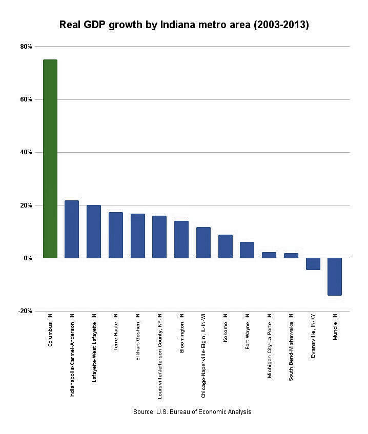 By comparison, the Columbus metro area’s real GDP grew 75% from 2003 to 2013 — the sixth highest growth rate among 385 U.S. metro areas over the decade and the highest among Indiana’s metro areas.