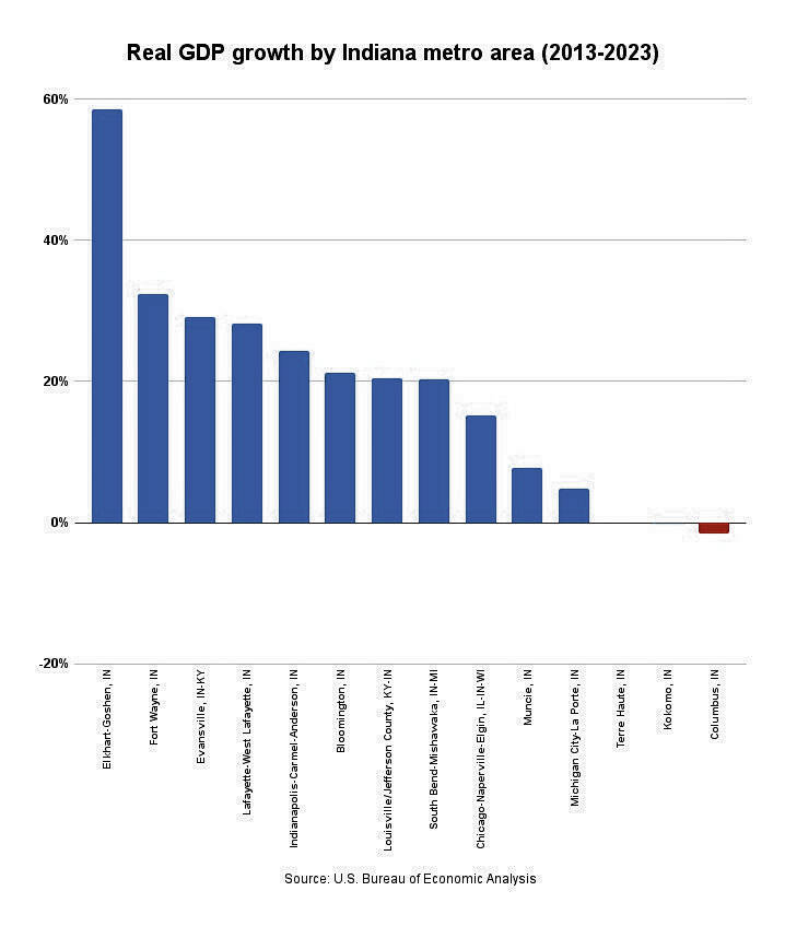 From 2013 to 2023, the Columbus metro area’s real gross domestic product (GDP) edged down 1.6%, the lowest growth rate among Indiana’s metro areas during the period, according to the most recent figures from the U.S. Bureau of Economic Analysis.