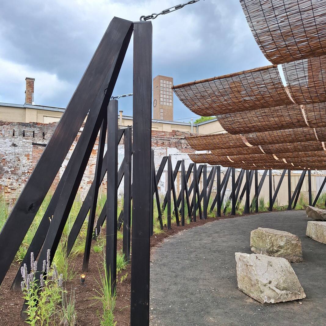 Kathy Roemmel captured the tower of First Christian Church in the background of the exhibit “Ellipsis” at the site of the former Irwin Block Building on opening day of Exhibit Columbus.