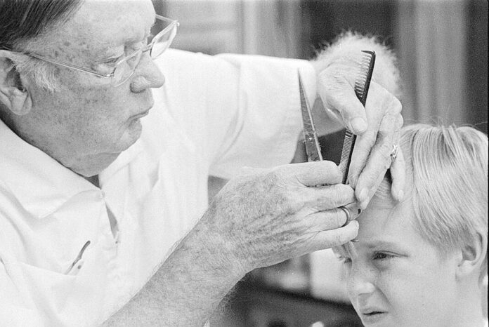 Barber Arthur Lee Stewart, 81, cuts the hair of Craig Yeley at his shop at 1521 17th St., on Sept. 2, 1975. Stewart began barbering in 1915.