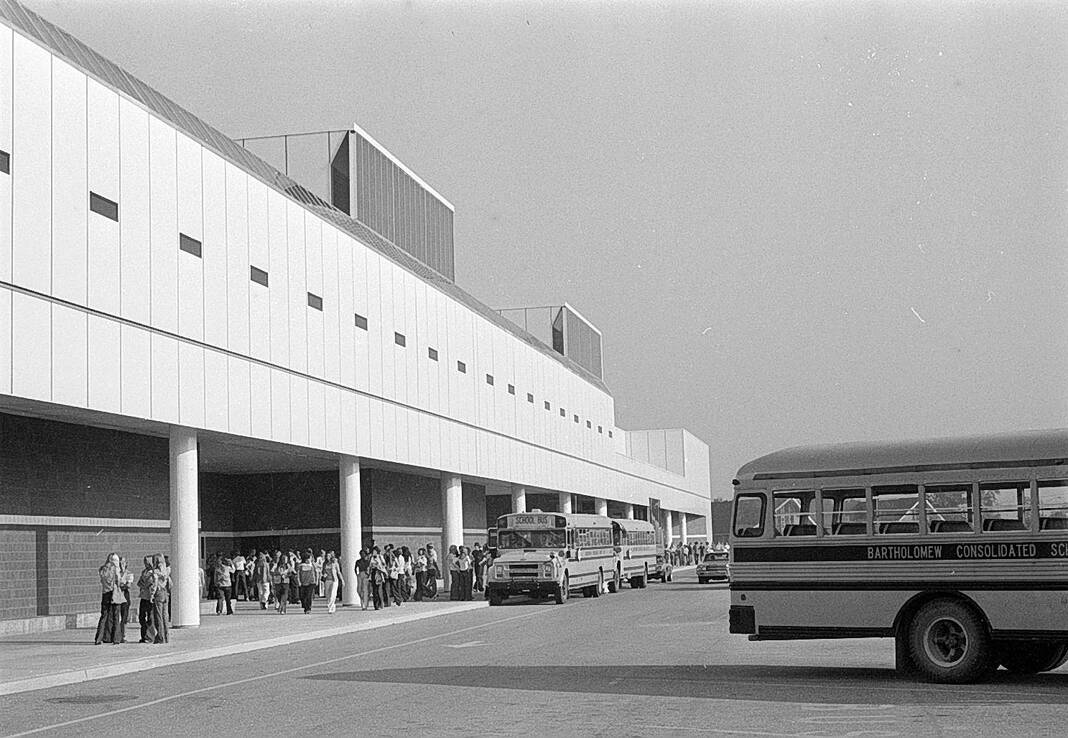 Bartholomew Consolidated School Corp. buses unload pupils at Columbus East High School as school began with a half-day enrollment session on Sept. 2, 1975.