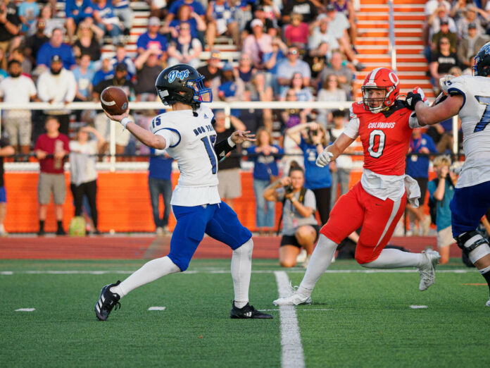 Columbus North quarterback Asher Ratliff throws a pass as Columbus East’s Bige Asher (0) closes in during Friday’s football game against Columbus East in Bob Gaddis Stadium at Columbus East High School.