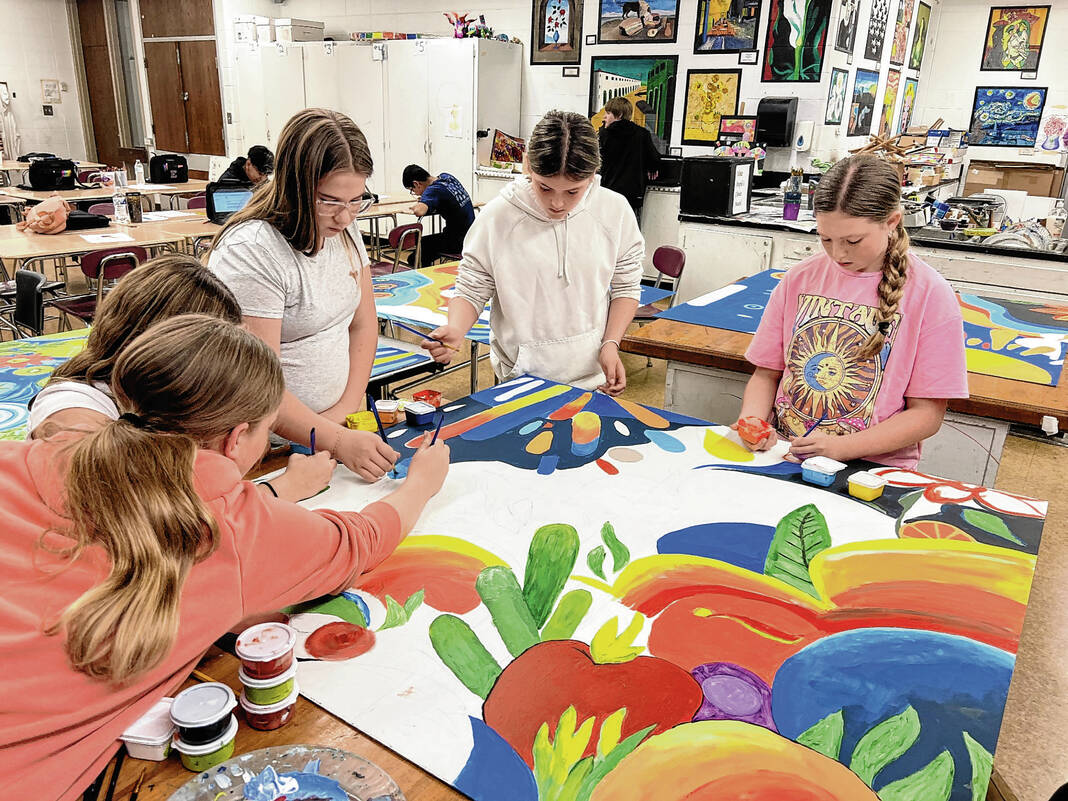 Edinburgh middle and high school students work together to design the mural for the Edinburgh Food Pantry. The mural currently hangs in the lobby as people wait for their turn to shop.