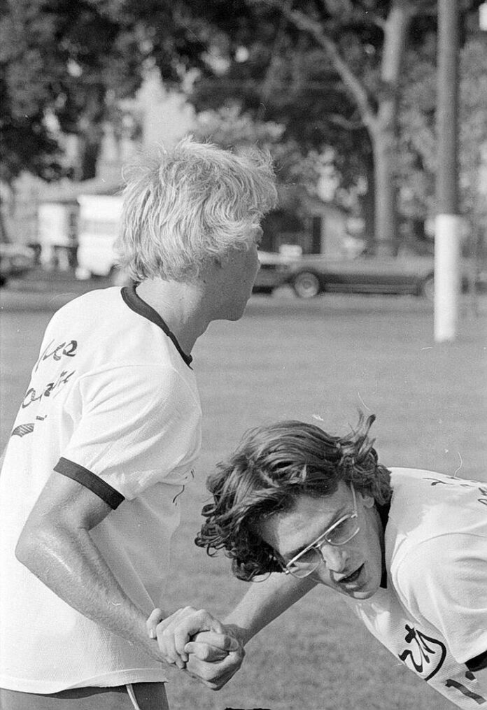 Jon Finke, left, and Don Reeves of Columbus North congratulate each other after finishing 1-2 on Sept. 9, 1975, in the opening dual cross country meet of the season. Finke won the race in 12:15 and North won the meet, 16-47.