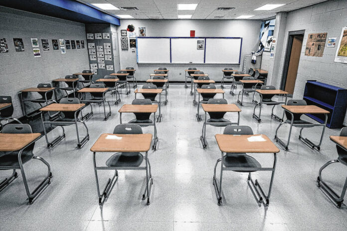 Mike Wolanin | The Republic Desks are shown in Katy Hubbard’s classroom at Columbus North High School in Columbus, Ind., Tuesday, July 28, 2020.