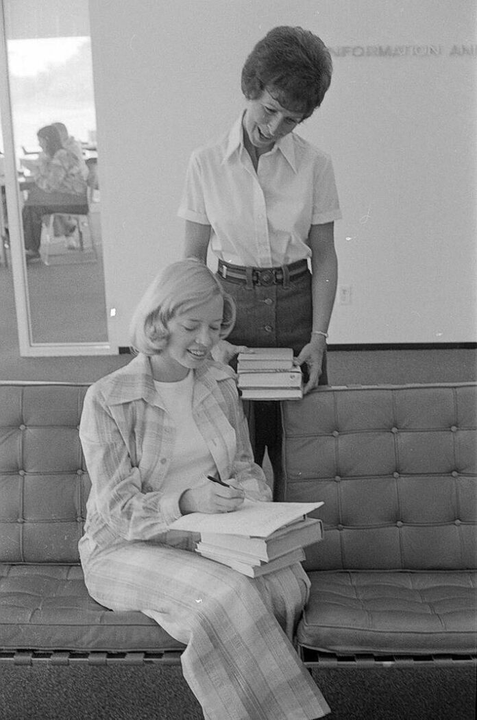 Looking forward to a season of good reading and challenging discussion, Barbara Piper, seated, chairman of the literature division of the Columbus Arts Guild, goes over the list of chosen authors, ranging from Erica Jong to Margaret Mead, with Barbara Stein, secretary of the group, on Sept. 12, 1975.