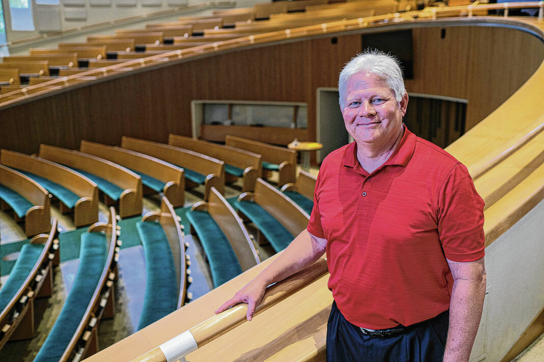 Mike Wolanin | The Republic St. Peter’s Lutheran Pastor Mark Teike poses for a photo in the sanctuary at St. Peter’s Lutheran Church in Columbus, Ind., Tuesday, Aug. 9, 2022. Pastor Teike has announced he is retiring after serving the church for 30 years.