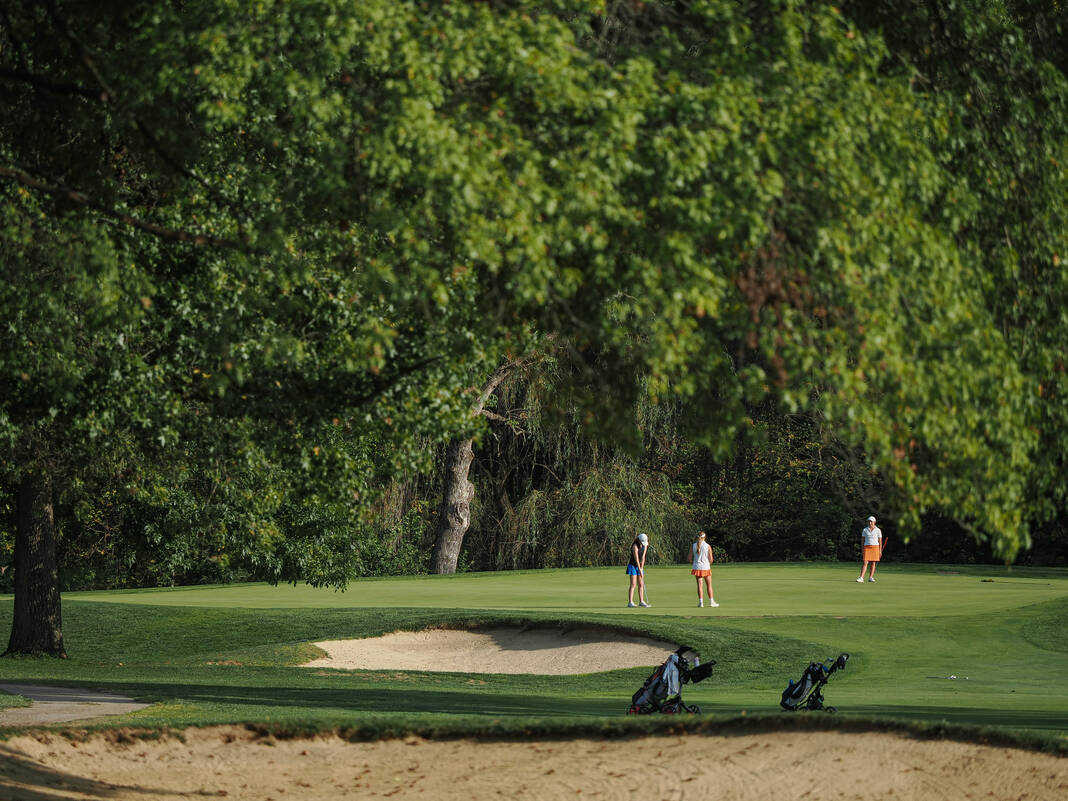 Columbus North’s Harper Andresen holds the pin as Columbus East’s Amaylie Walsh, left, and Calleigh Gill finish putting on the first hole during a golf match at Otter Creek Golf Course in Columbus, Ind., Tuesday, Sept. 16, 2025.