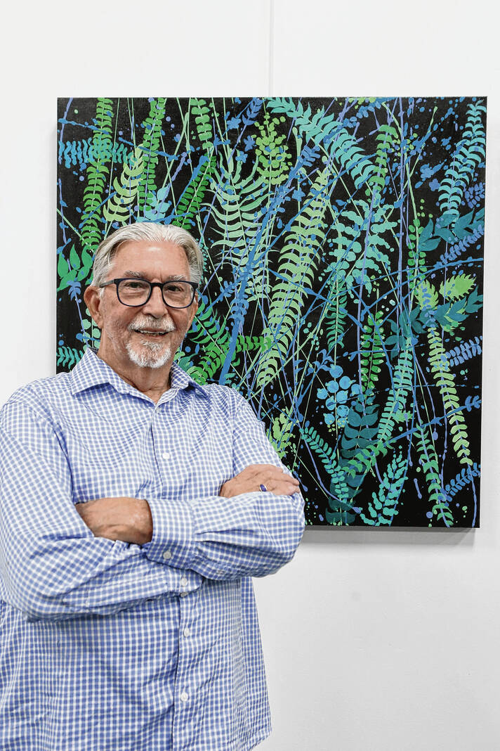 Carla Clark | For The Republic Jerry Points poses for a photograh in front of one of his paintings during a reception featuring The Vibrant Vision of Jerry Points held at the Art in Focus Gallery, Stillframes Art & Design in Columbus, Ind., Thursday, September 11, 2025.