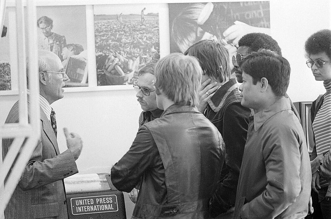Publisher Robert N. Brown of The Republic talks about international news operations with a touring group of international journalists who visited the newspaper plant on Sept. 16, 1975.