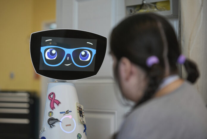 The robot with a sleek white triangle-shaped frame that Khachikyan said was designed for hugging, rolled into a room with a teenager injured in a car accident. The robot played what it described as his favorite song — “No Fear” by DeJ Loaf — and he danced along. In the hallway, Robin cracked up a young child held by her mother when it put on a series of silly glasses and a big red nose. In another room, the robot played a simplified version of tic-tac-toe with a patient.