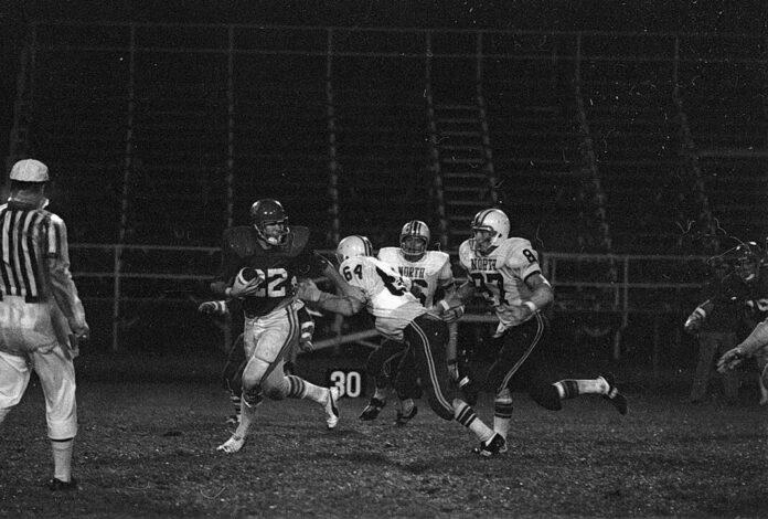 Chasing down Connersville quarterback Chuck Boulware (22) are three Columbus North defenders. Scott Everroad (64) has Boulware by the jersey and Larry Kleinhenz (87) moves in to help on Sept. 20, 1975.
