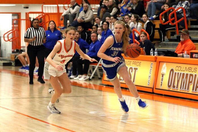 Jennings County’s Mollie Ernstes drives against Columbus East’s Ella Anthis Jan. 23 at Columbus East.