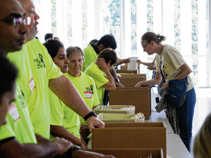 Mike Wolanin | The Republic Volunteers help Mill Race Marathon participants pick up their race packets during the Mill Race Marathon health and fitness expo at The Commons in Columbus, Ind., Friday, Sept. 26, 2025.
