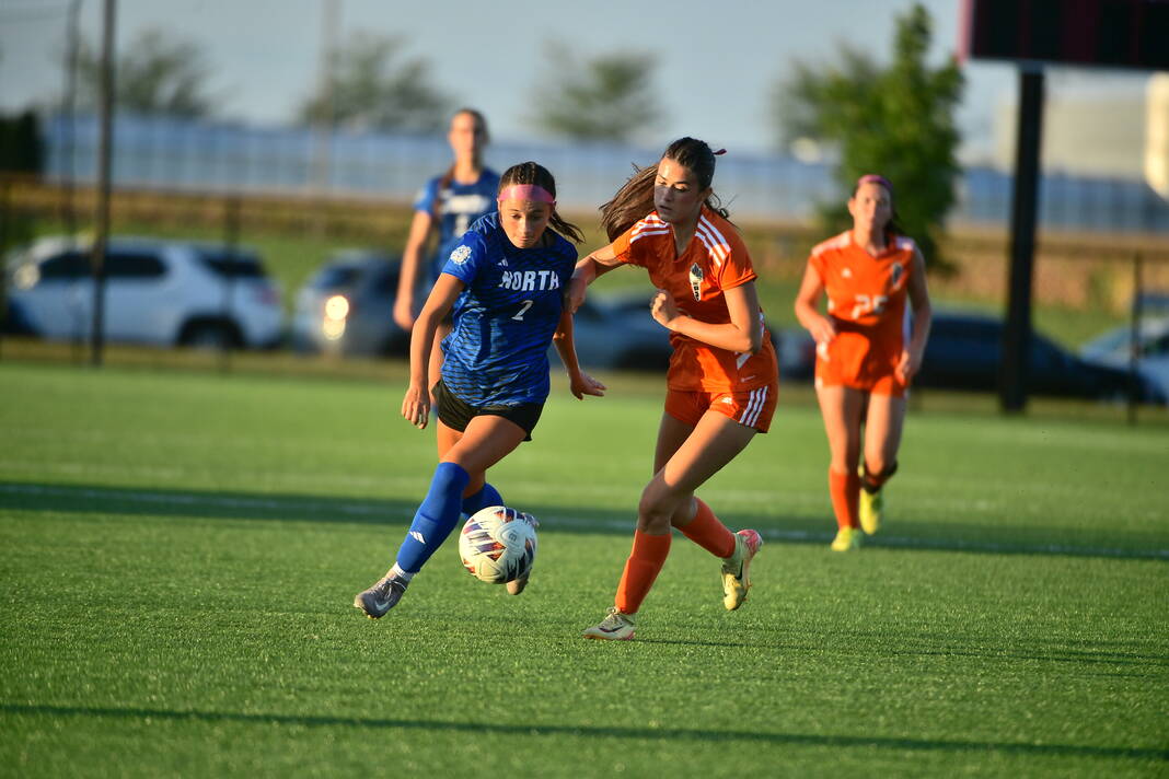 Columbus North’s Avery Baker and Columbus East’s Gigi Ghuman battle for the ball Aug. 27 at BCSC Soccer Complex.