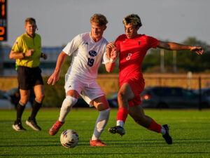 Columbus East’s Eduardo Aranda Michel, right, attempts to tackle the ball from Columbus North’s Parker Gribbins Aug. 28 BCSC Soccer Complex.