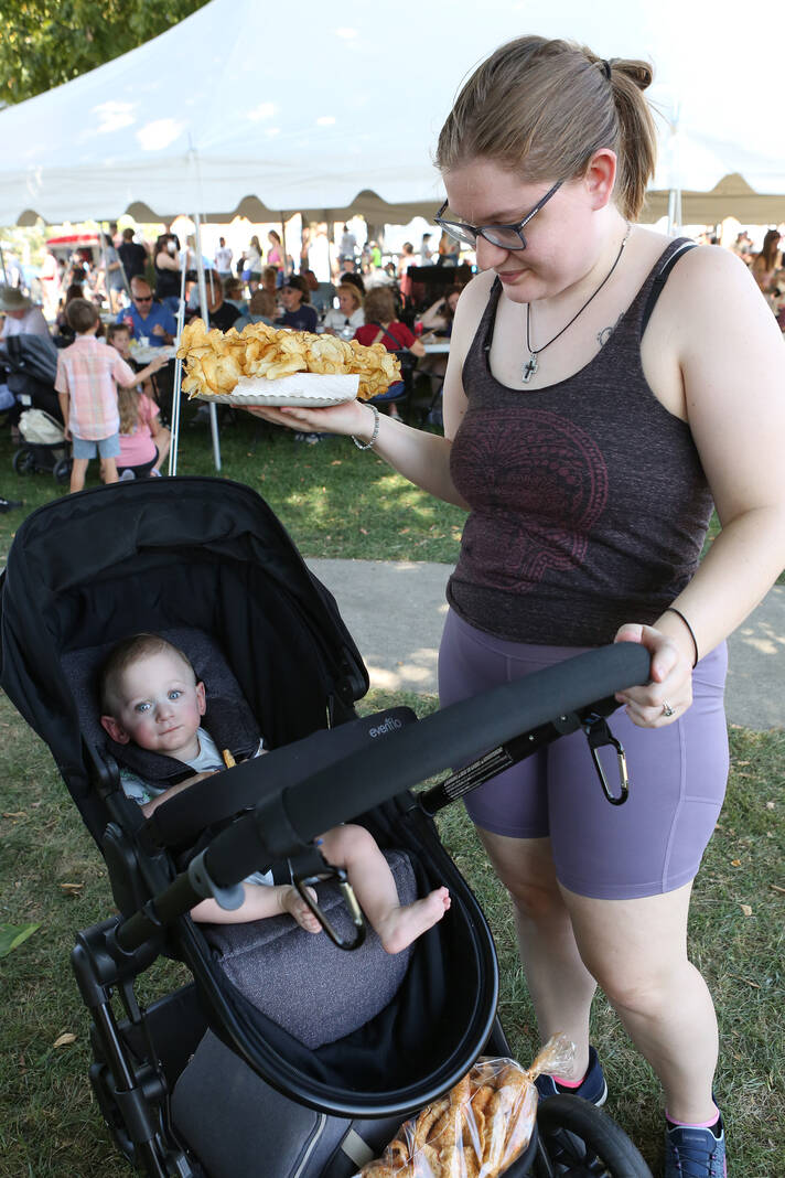 Carla Clark | For The Republic Tiffani Stillinger holds a plate of spiral fries as she waits with Elijah Wilson during the 57th Annual Hope Heritage Days, Hope, Ind., Sunday, September 28, 2025.