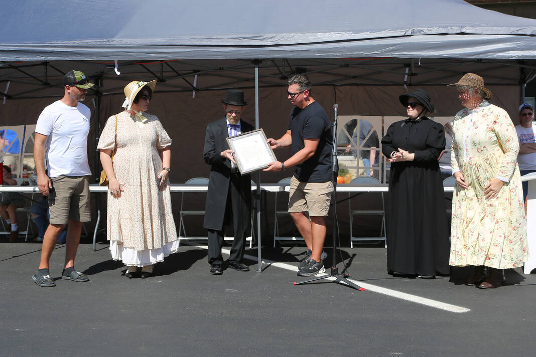 Carla Clark | For The Republic Chad Miller, from left, Jessica Deckard, John Ziegler, Jake Miller, Erin Anderson, and Susan Thayer Fye during the announcement that the Yellow Trail Museum has been selected to be the Grand Marshal of the 2025 Hope Heritage Days Parade, during the 57th Annual Hope Heritage Days, Hope, Ind., Sunday, September 28, 2025.