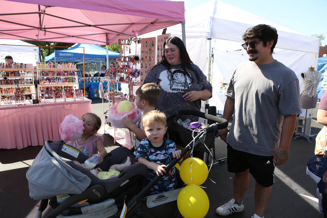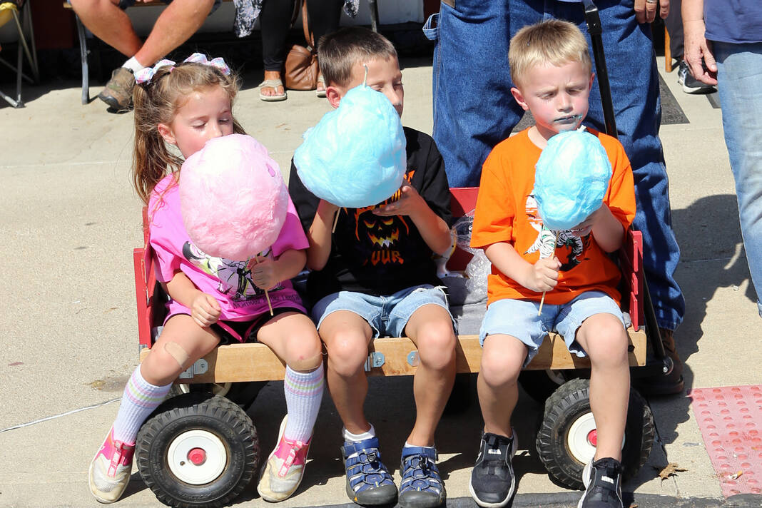 Carla Clark | For The Republic Elin Heck, Coby Heck and Sawyer Heck eat Candy Art cotton candy as they wait for the parade to start during the 57th Annual Hope Heritage Days, Hope, Ind., Sunday, September 28, 2025.