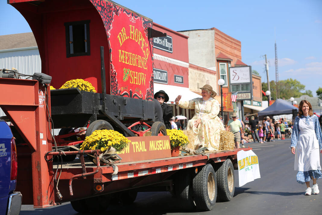 Carla Clark | For The Republic Erin Anderson, at left and Susan Thayer Fye wave from the Yellow Trail Museum float during the 57th Annual Hope Heritage Days parade, Hope, Ind., Sunday, September 28, 2025.