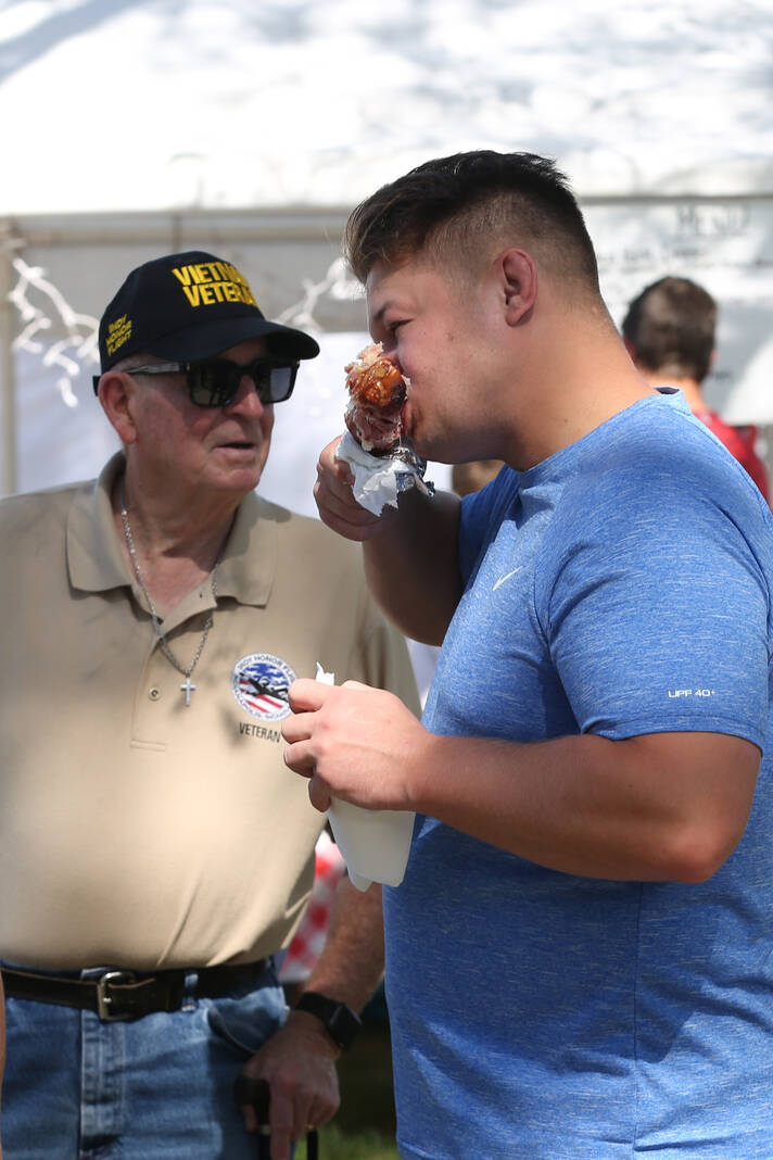 Carla Clark | For The Republic Vietnam Veteran Ken Chandler visits with Dawson Combest as he eats a smoked turkey leg from the Hawpatch-Hawcreek Convervation Club booth during the 57th Annual Hope Heritage Days, Hope, Ind., Sunday, September 28, 2025.