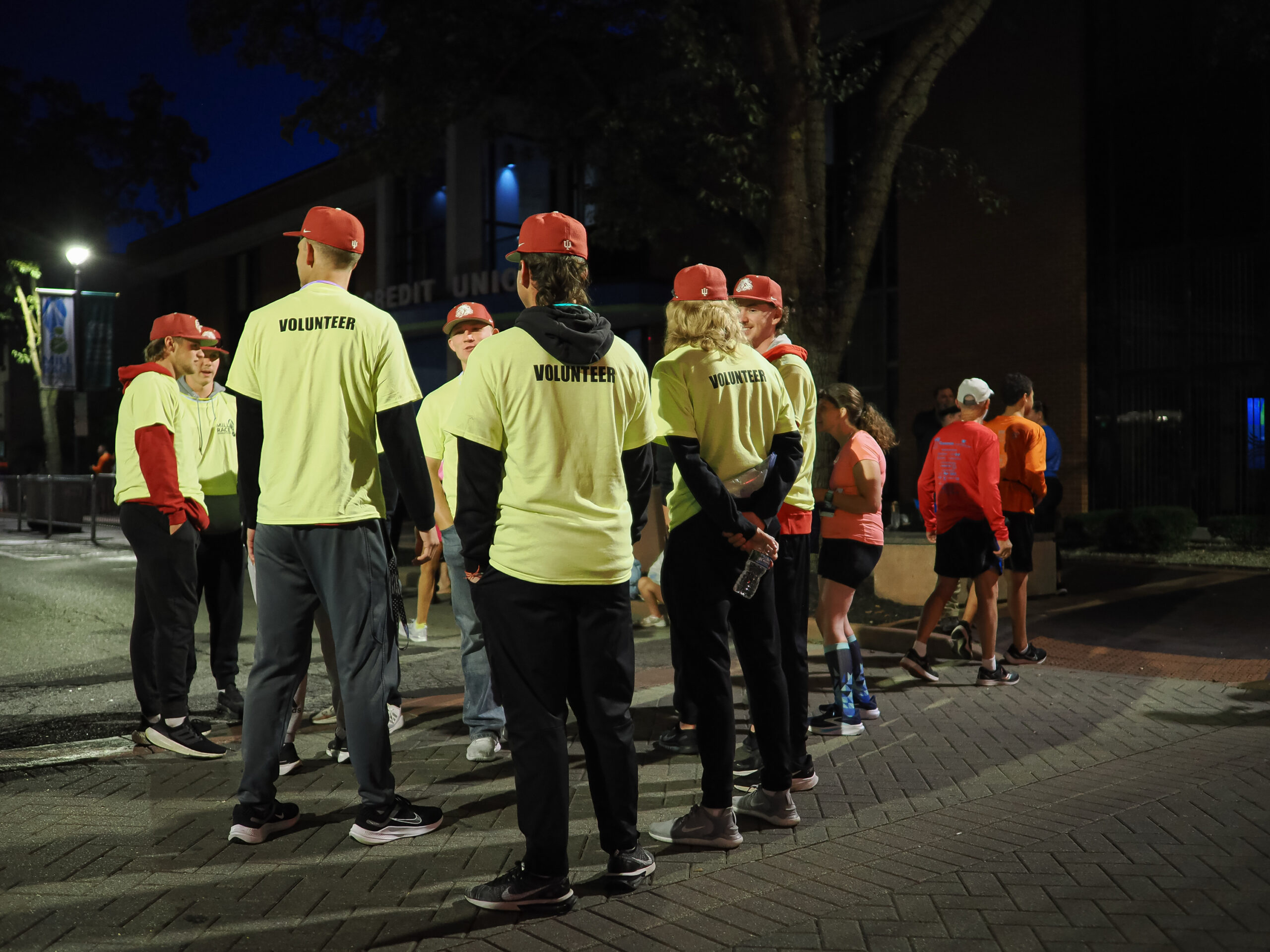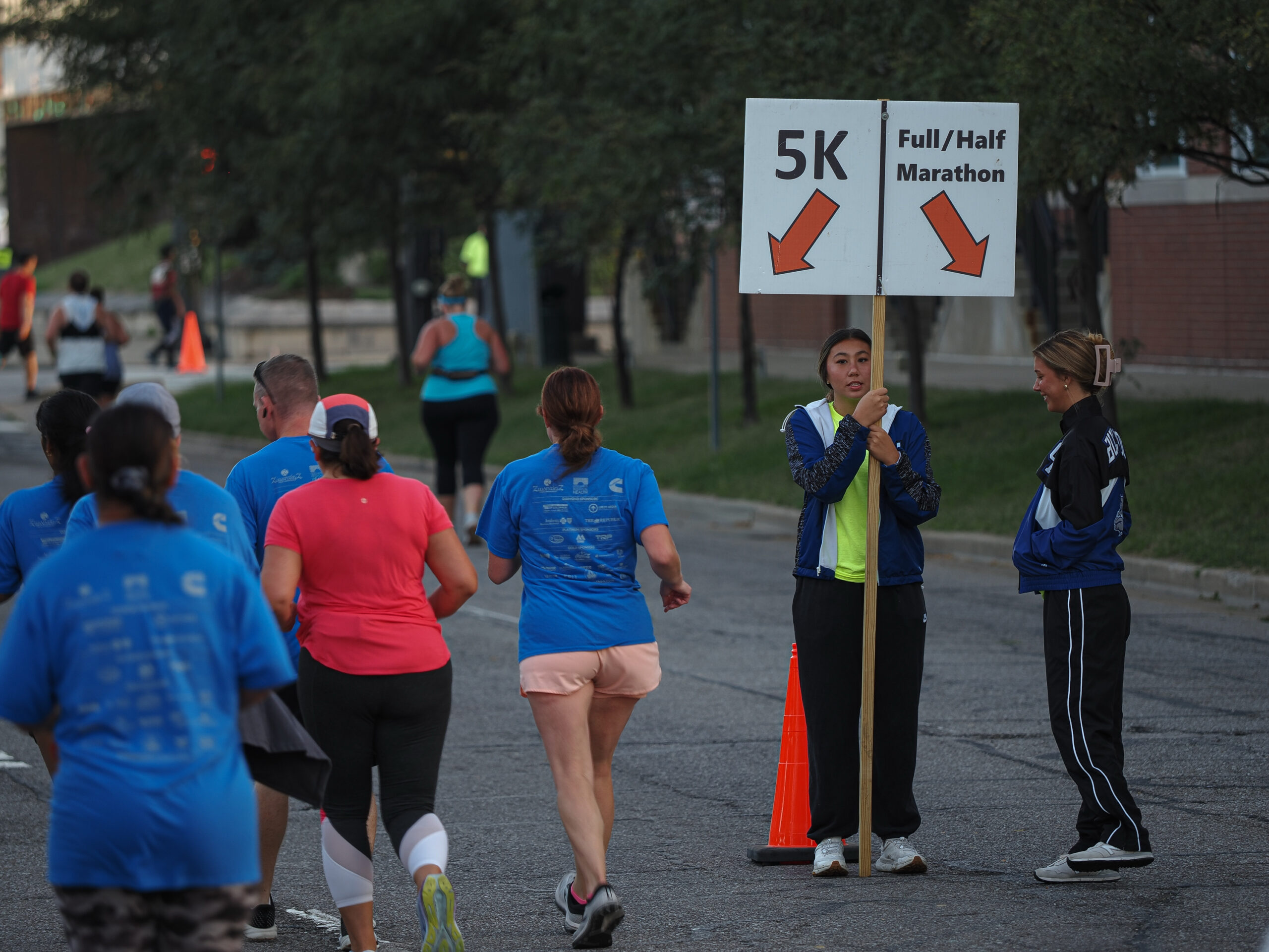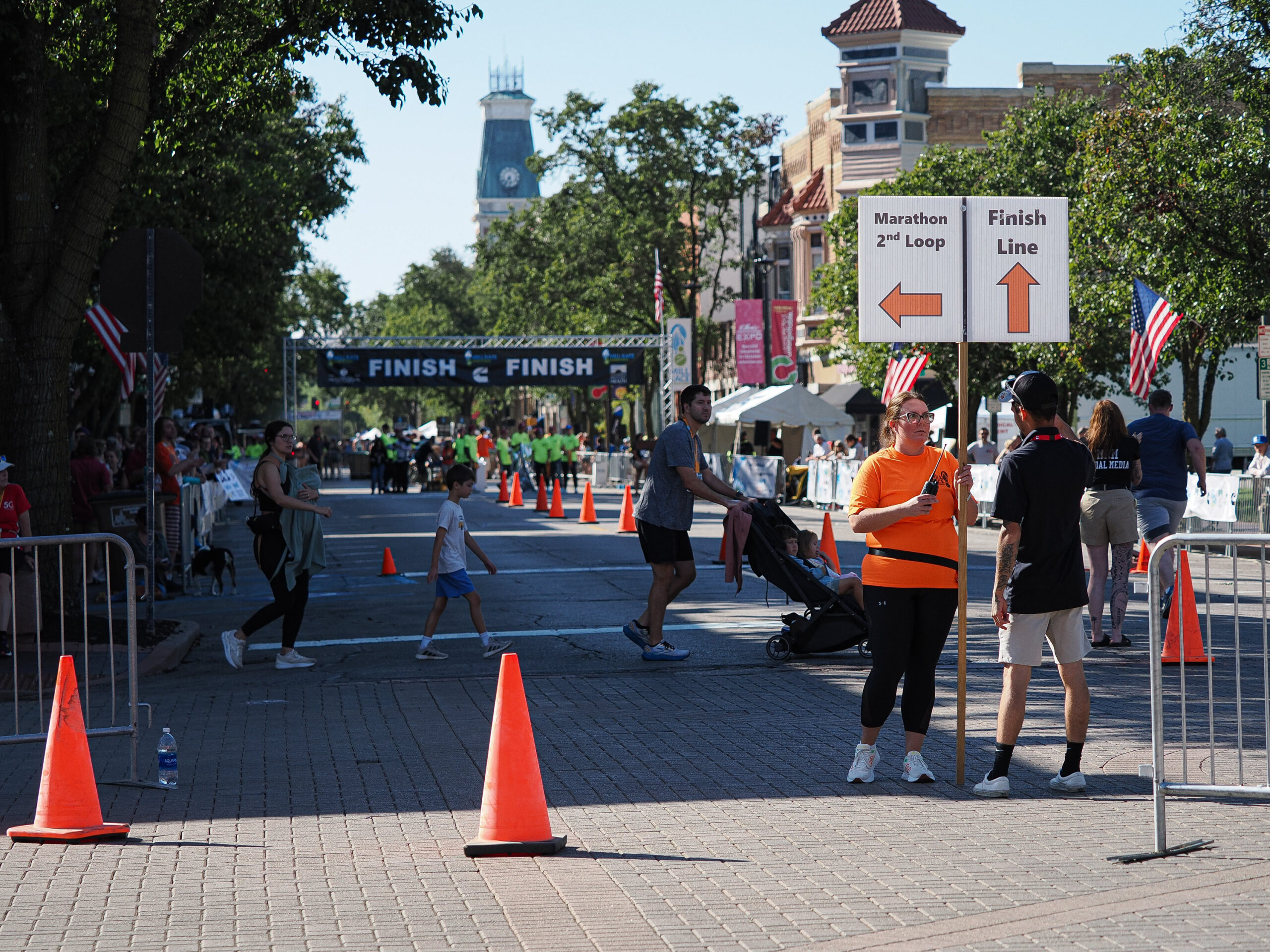 Volunteers gather at the intersection of Fifth and Washington streets for the Mill Race Marathon in downtown Columbus, Ind., Sept. 27, 2025.