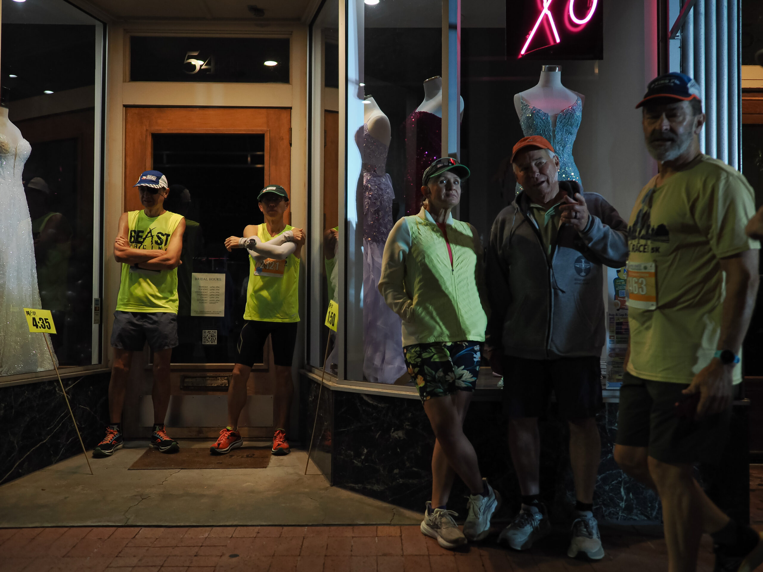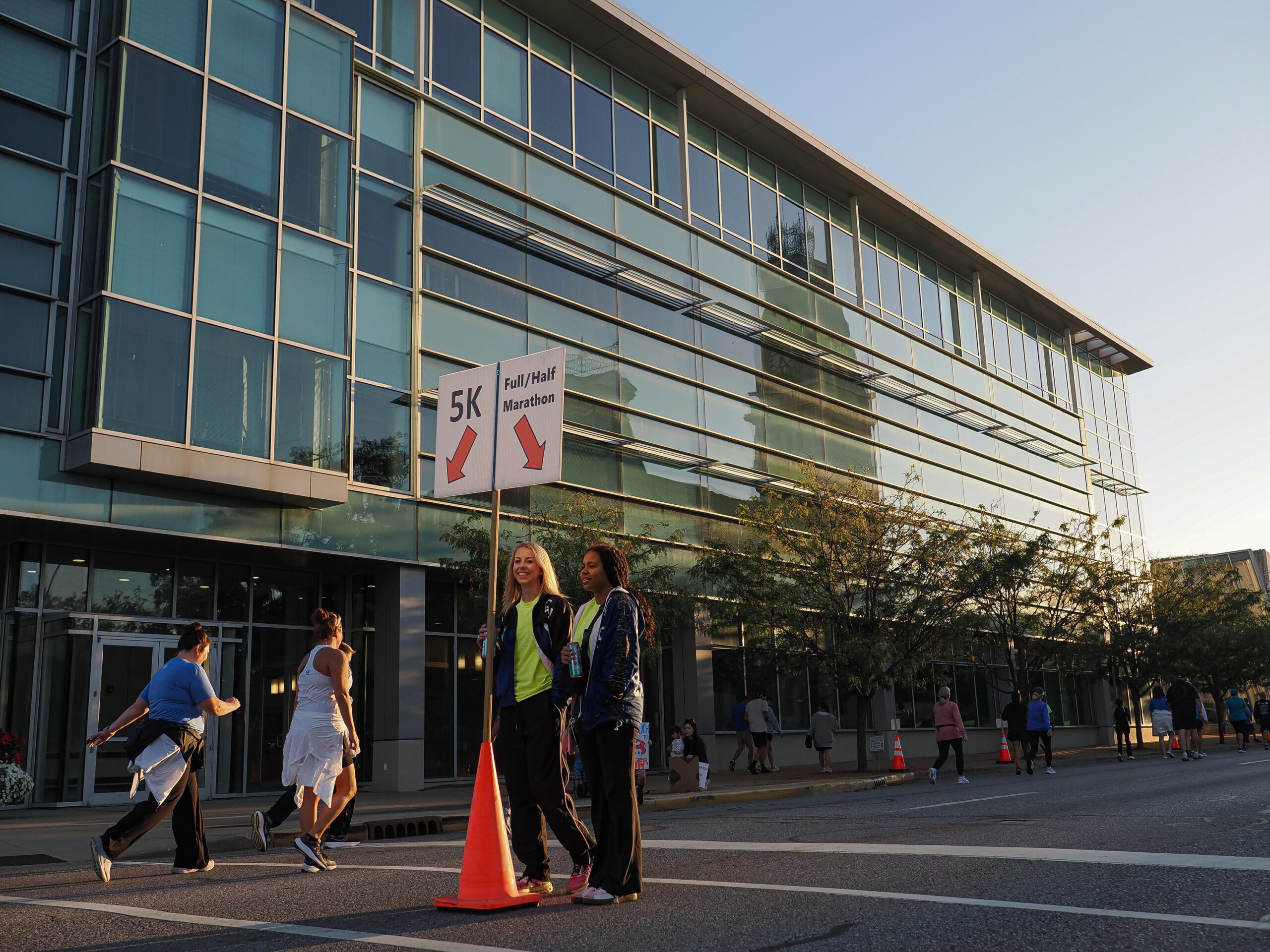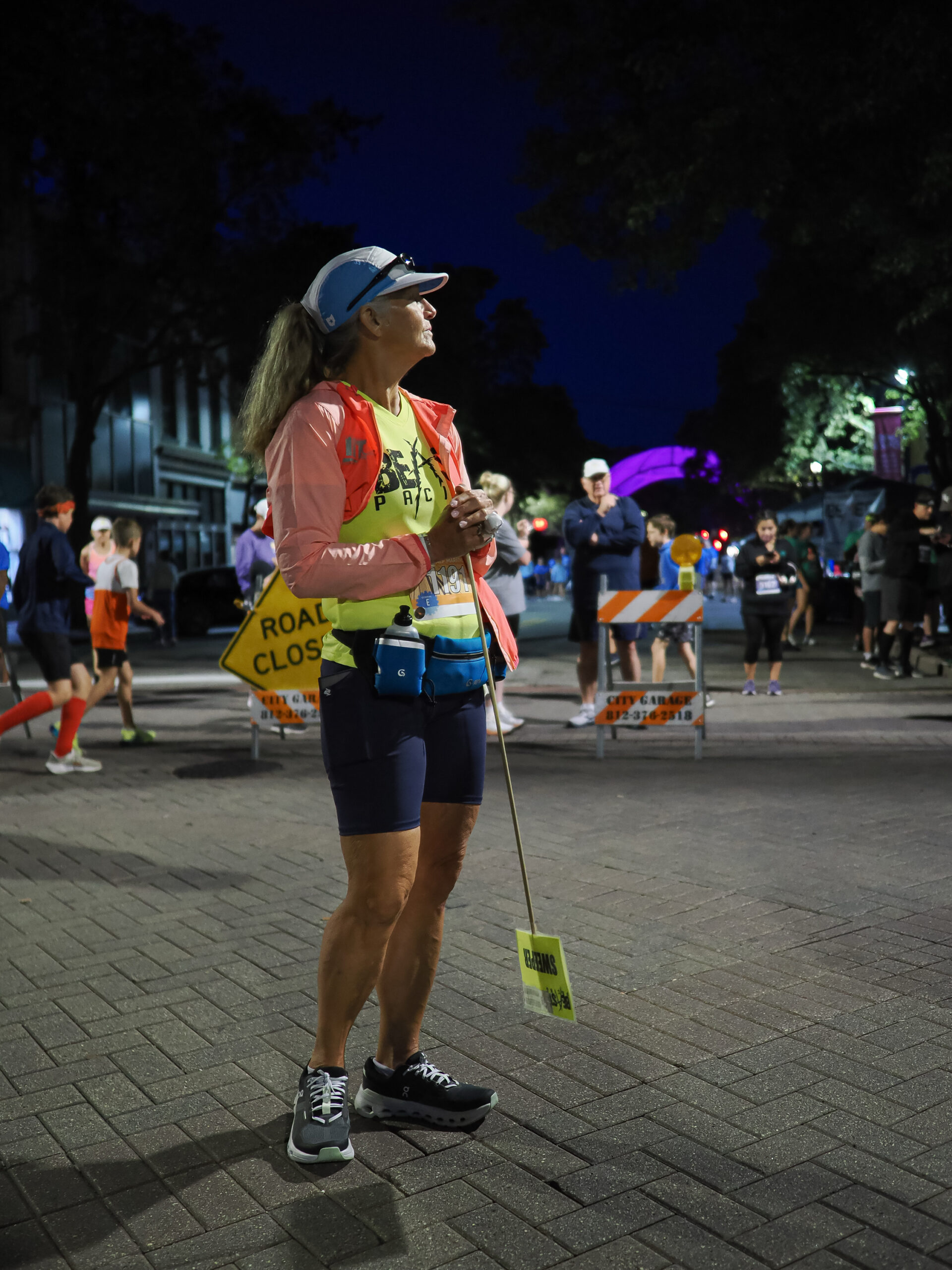 Volunteers gather at the intersection of Fifth and Washington streets for the Mill Race Marathon in downtown Columbus, Ind., Sept. 27, 2025.