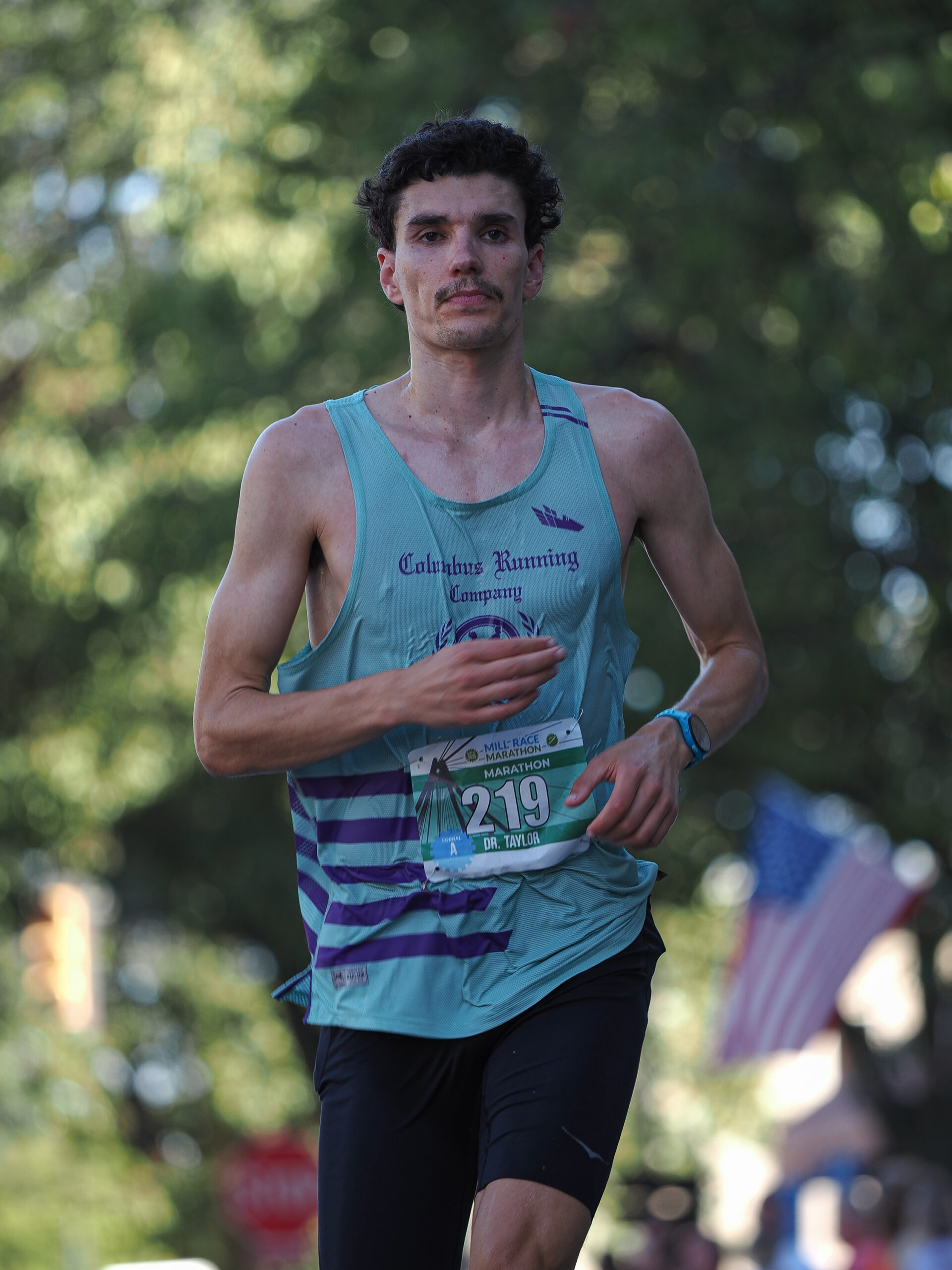 Andrew Taylor finishes second in the men’s division of the Mill Race Marathon in downtown Columbus, Ind., Saturday, Sept. 27, 2025.