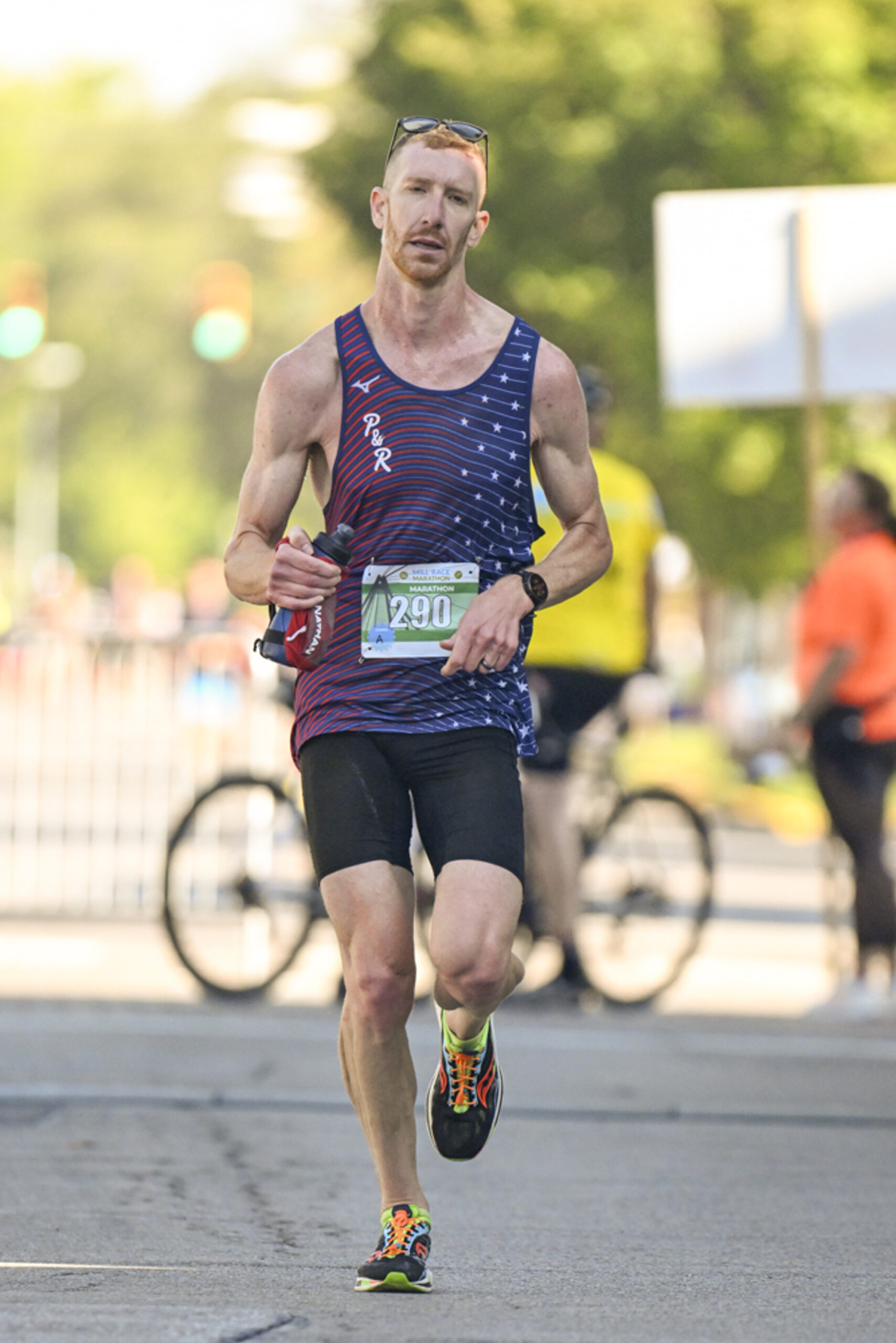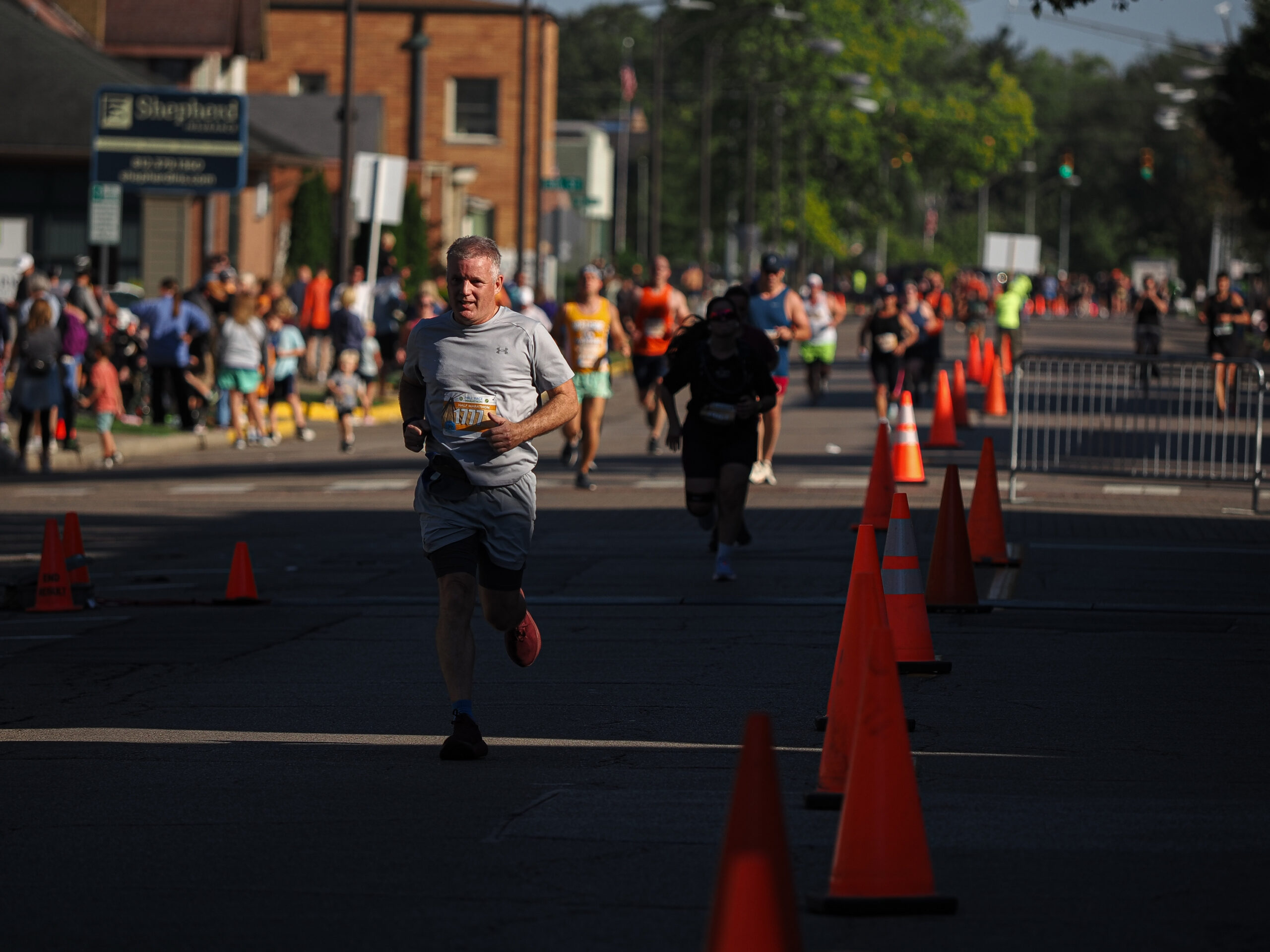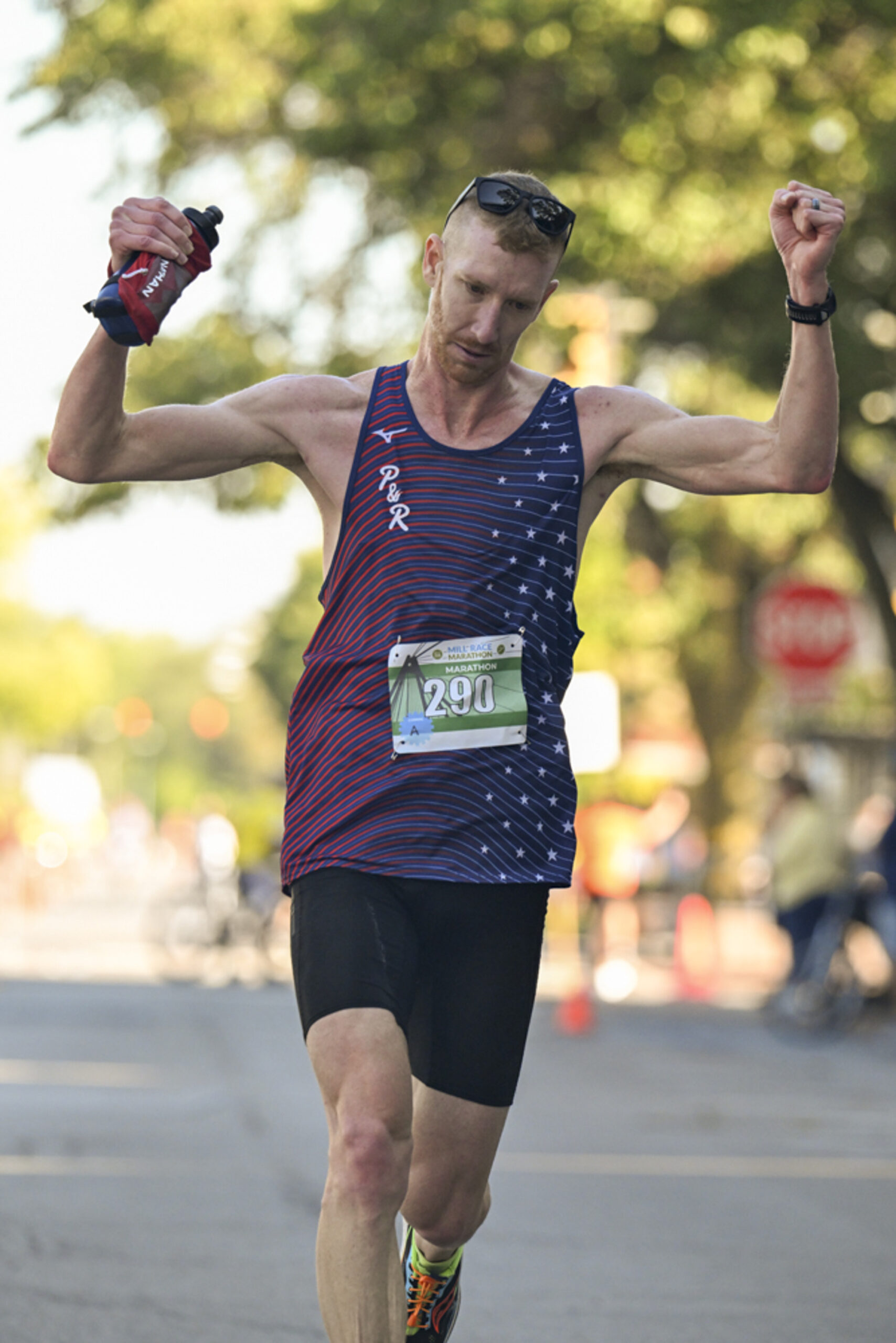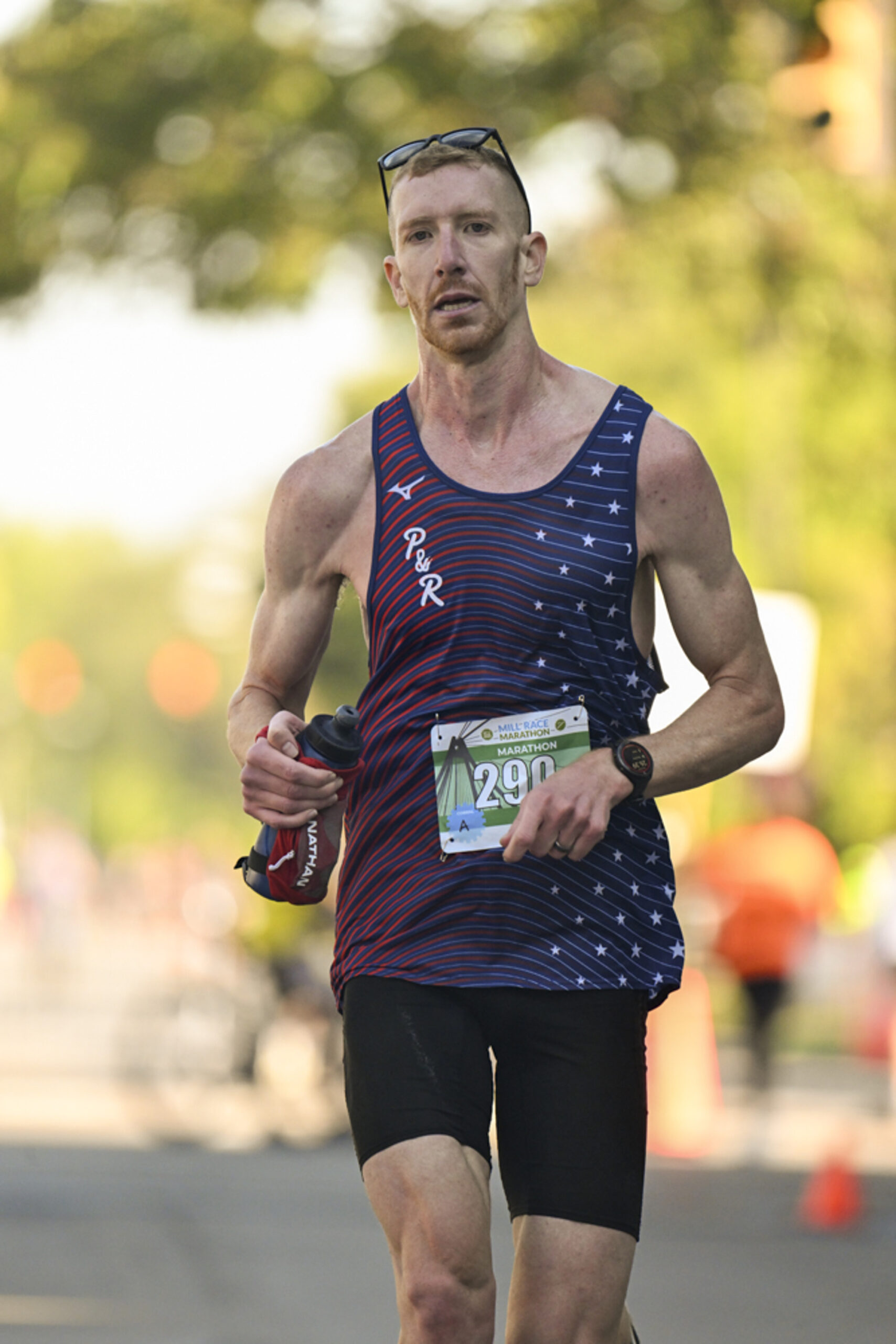 2025 Mill Race Marathon, Men’s 3rd place finisher, Mark Hamilton in the final leg to the finish line.