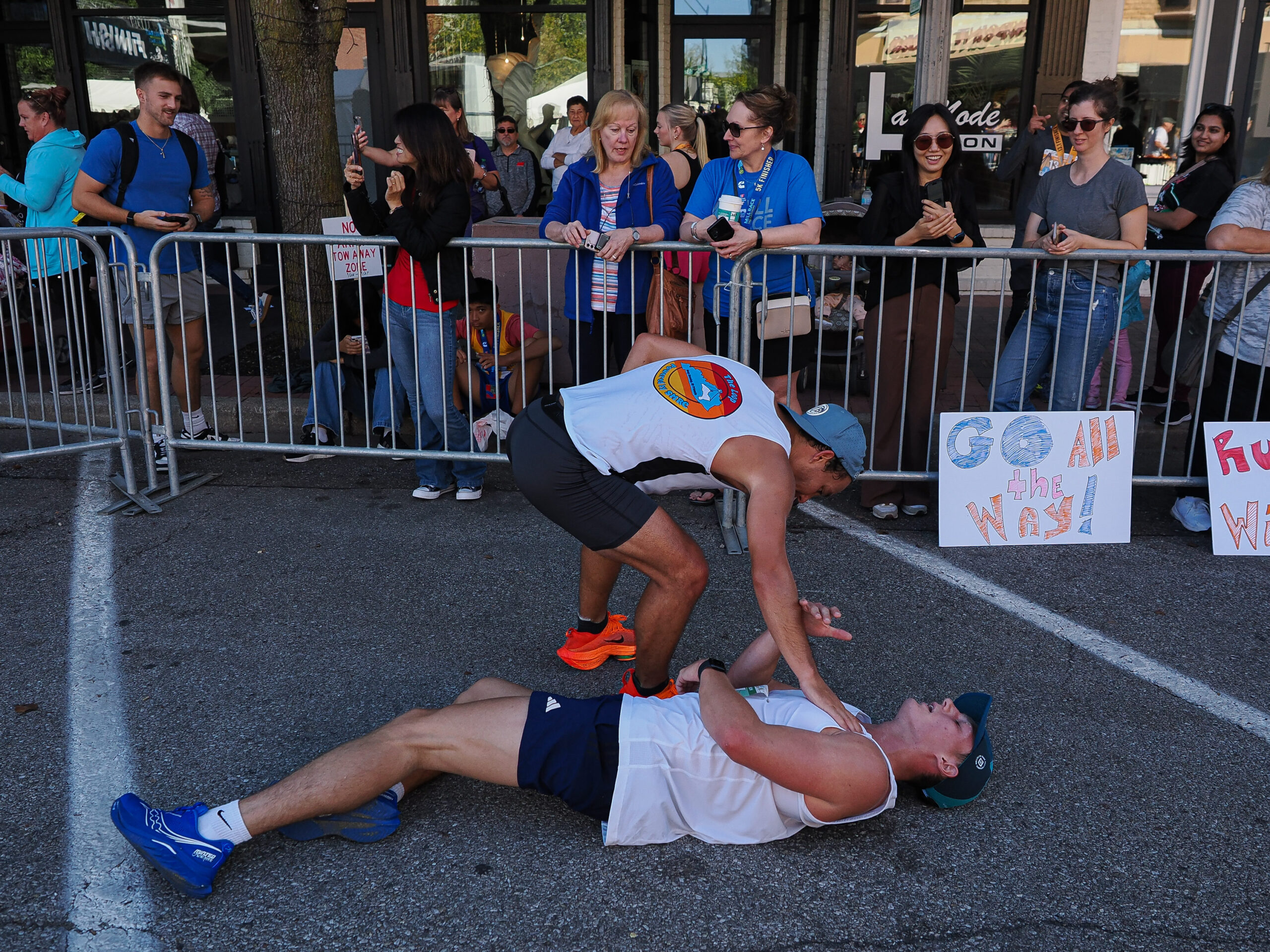 Logan Holmes, checks on Mitchel Minor at the finish line after they finished the full marathon portion of the Mill Race Marathon together in downtown Columbus, Ind., Sept. 27, 2025.
