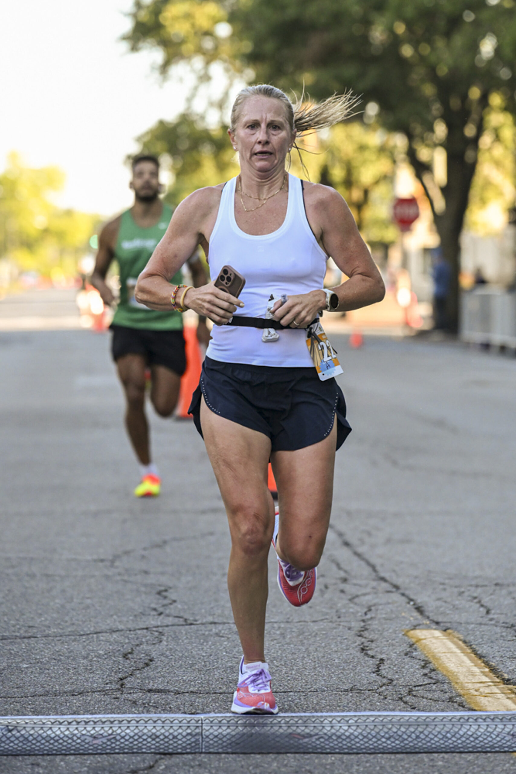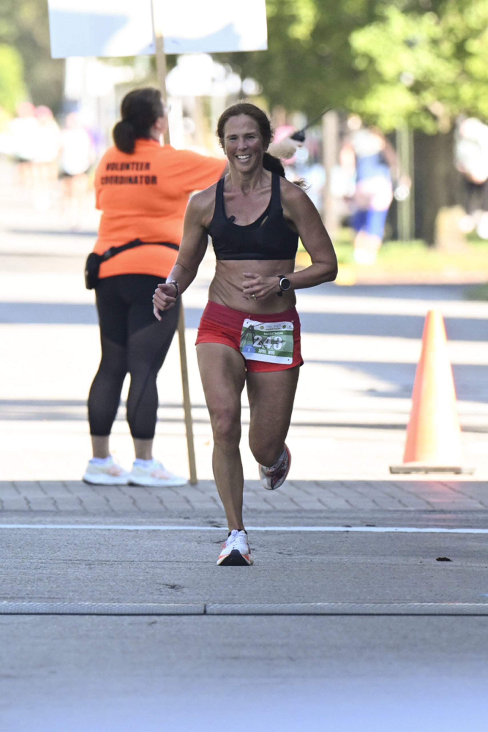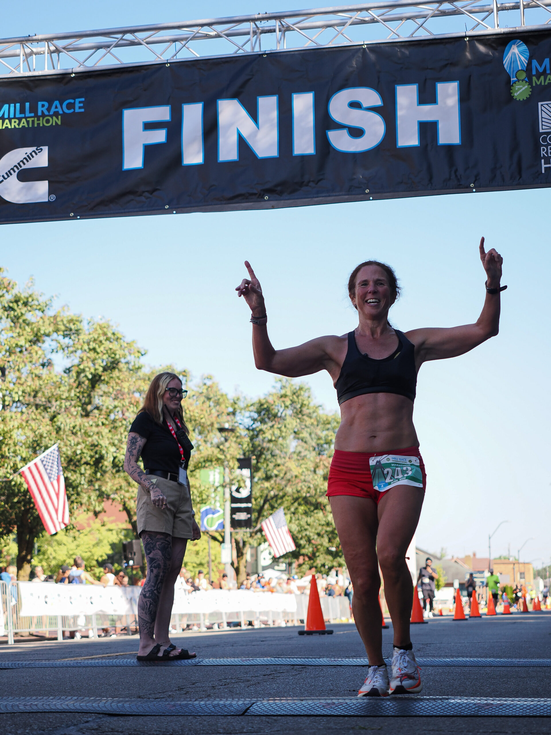 2025 Mill Race Marathon, Half Marathon Women’s 3rd place finisher, Jennifer Suverkrup crosses the start/finish line.
