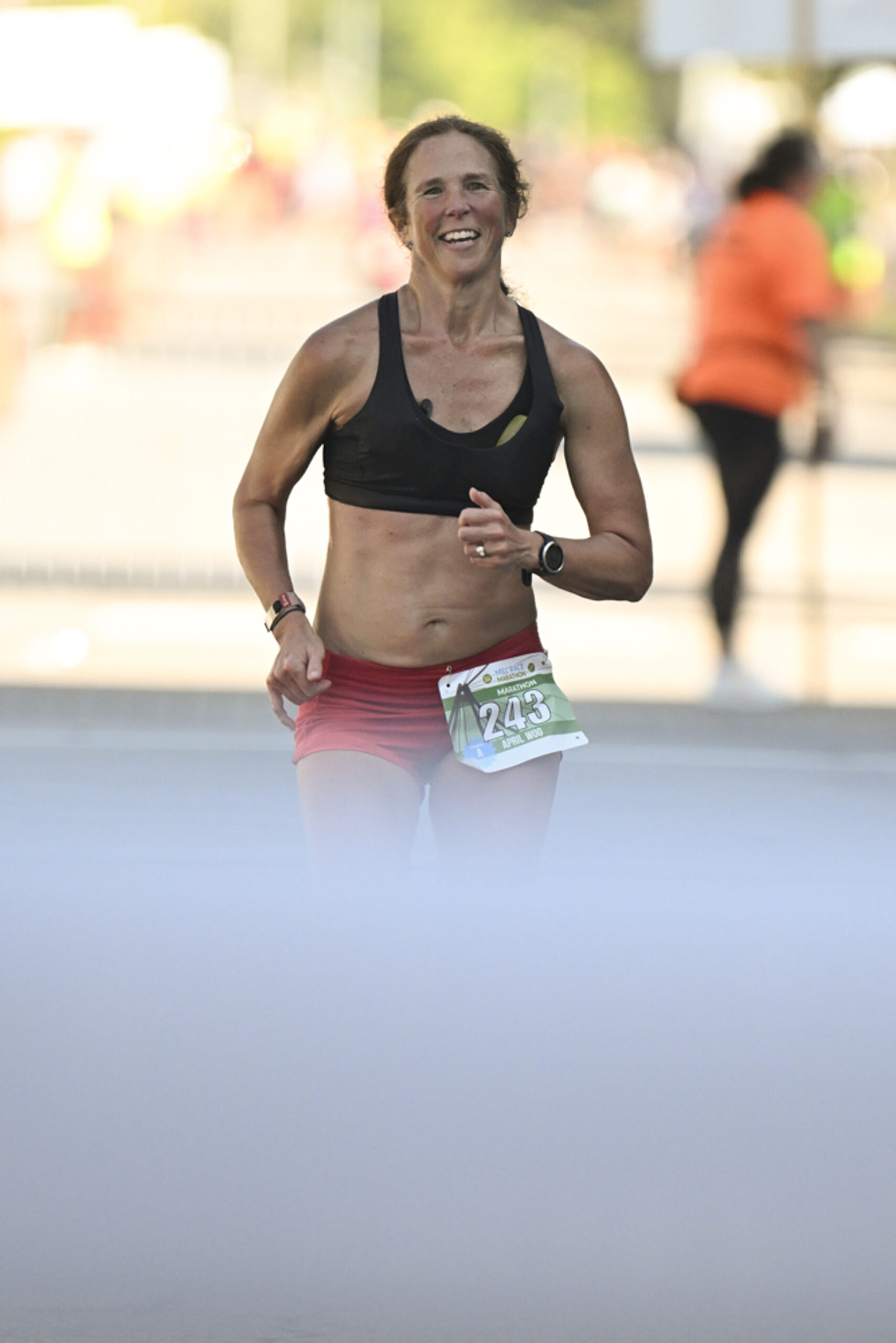 2025 Mill Race Marathon, Women’s winner, April Woo smiles for the crowd as she closes in on the finish line..