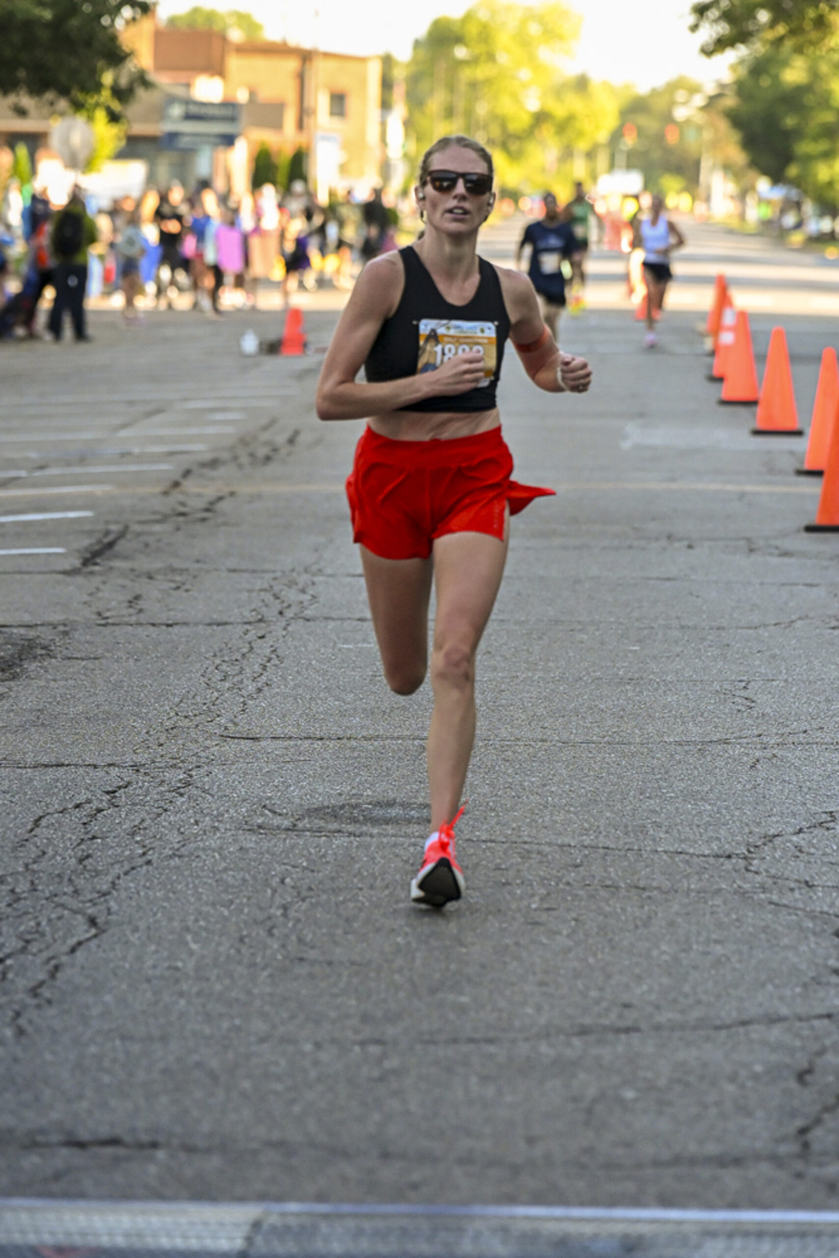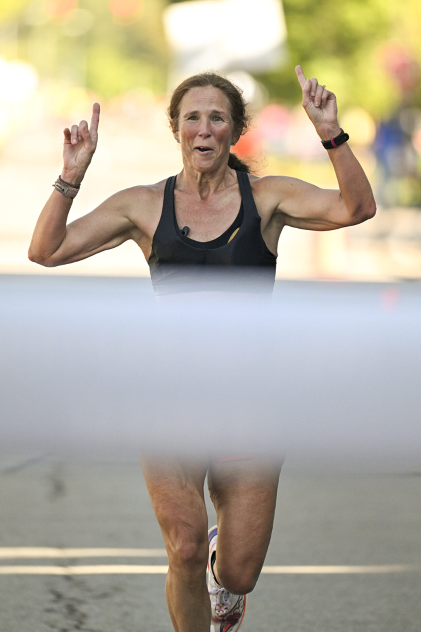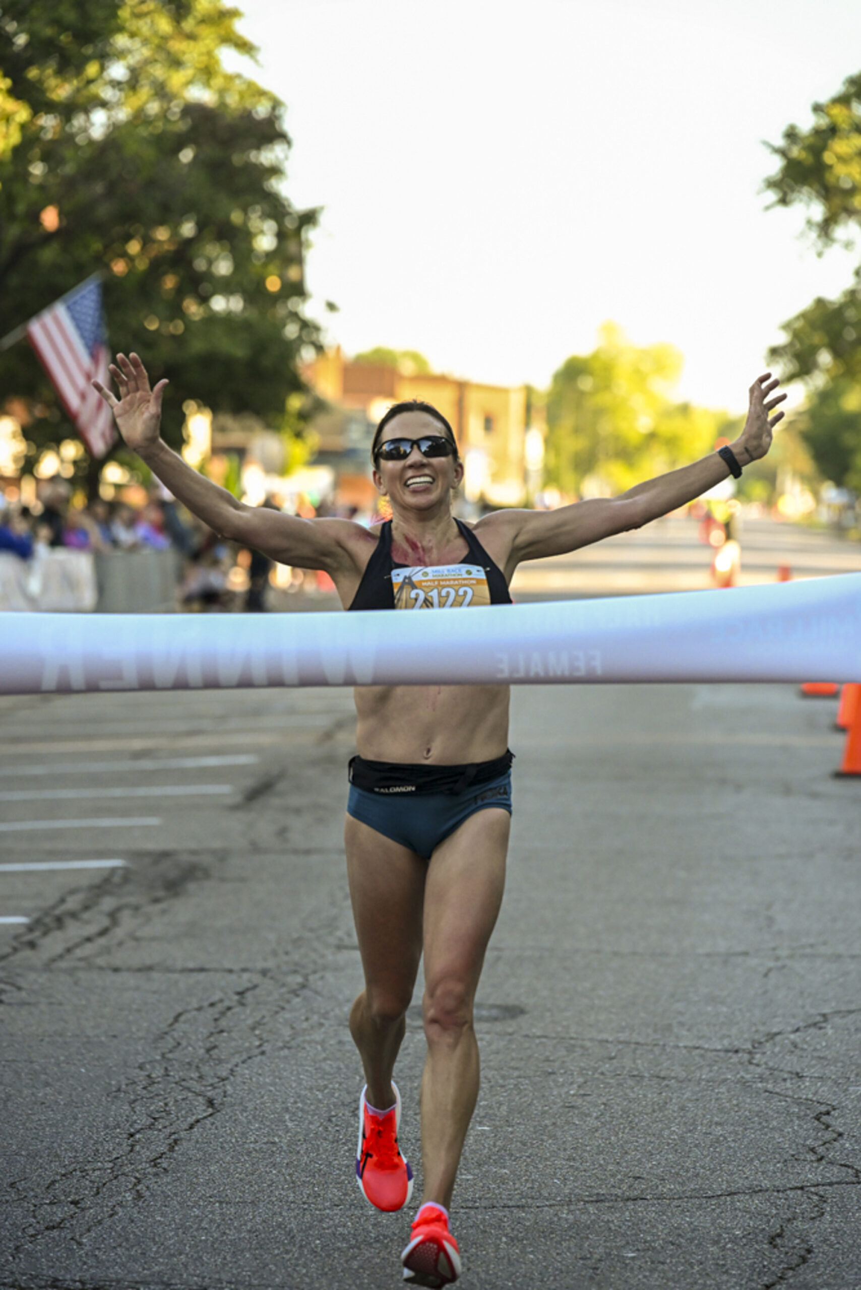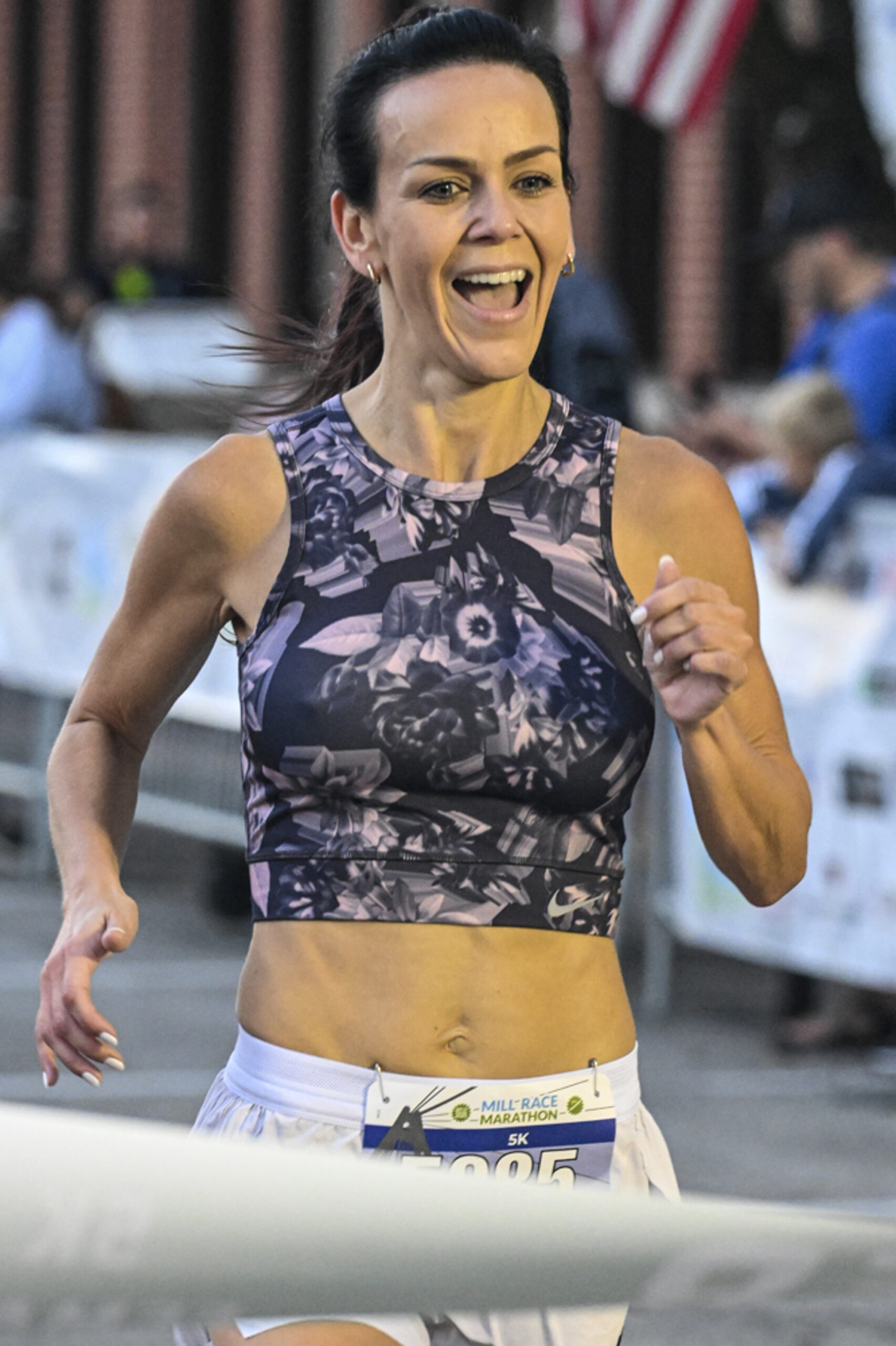 2025 Mill Race Marathon 5k Women’s winner, Ursula Conley crosses the start/finish line.