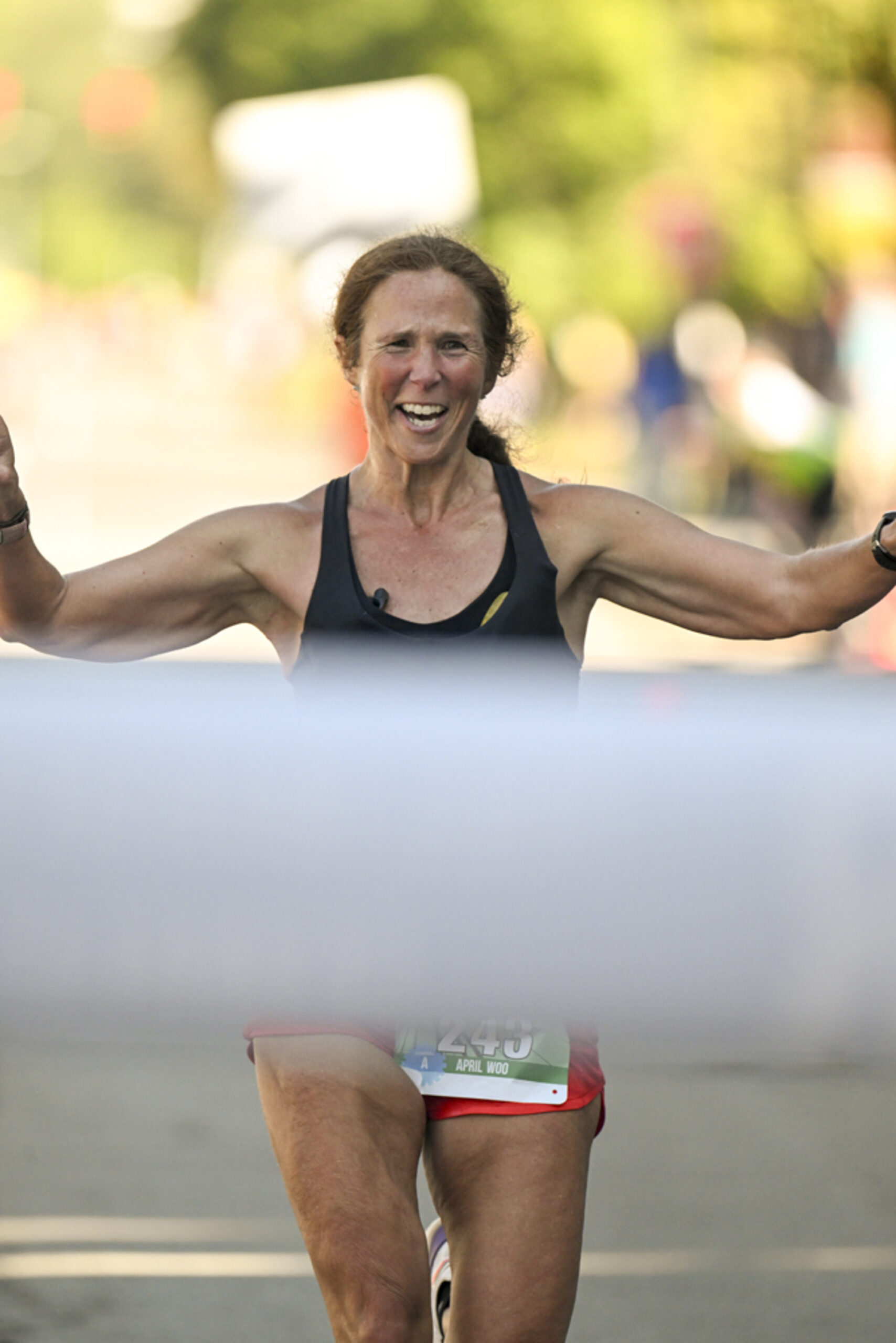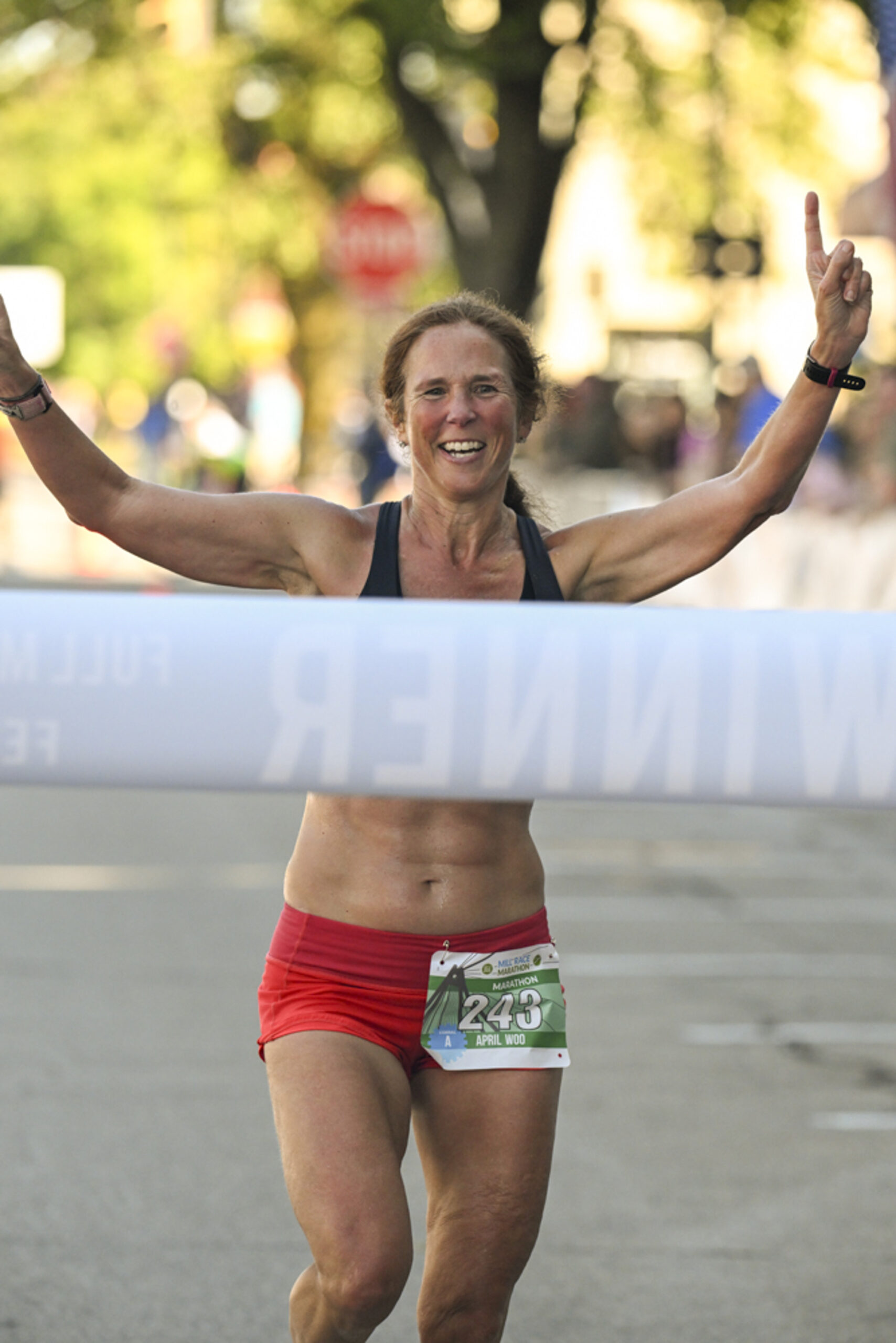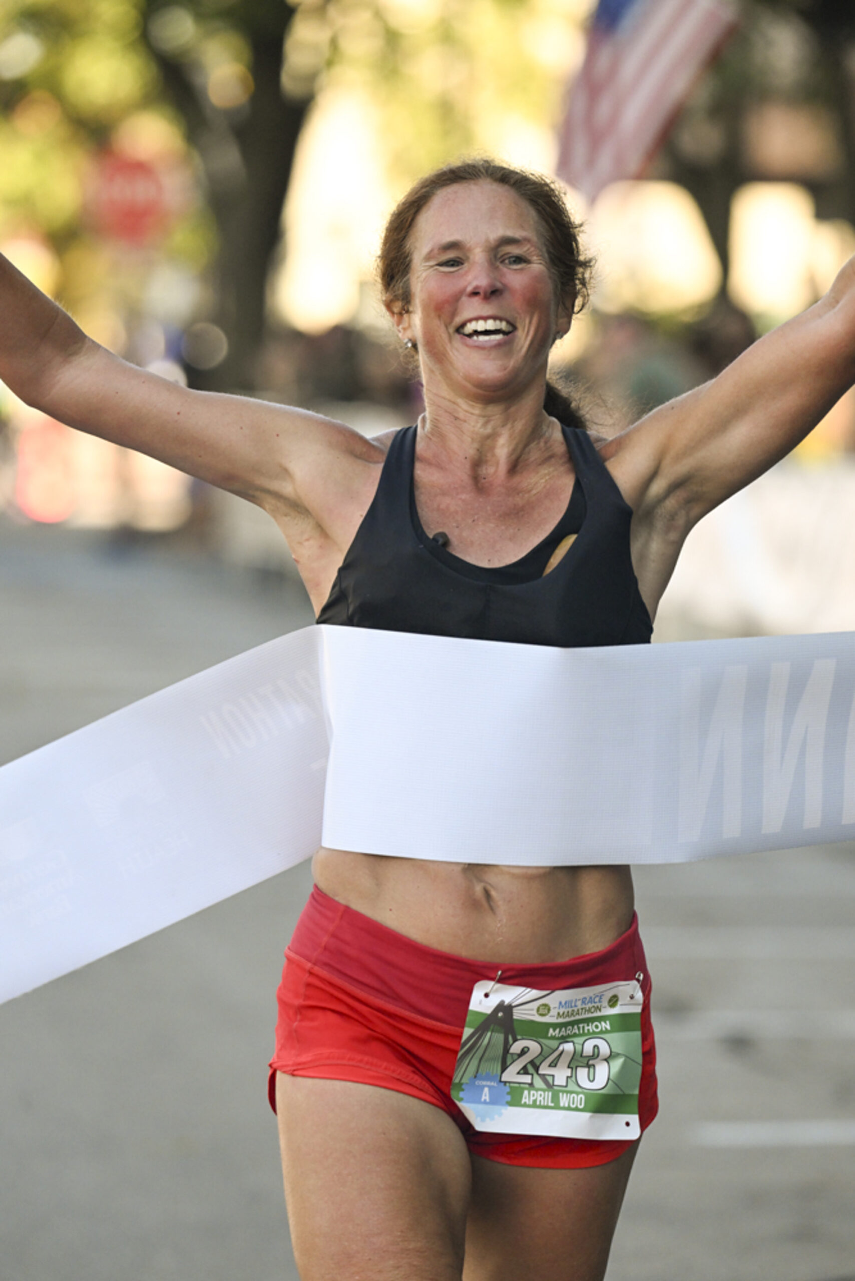2025 Mill Race Marathon, Women’s winner, April Woo celebrates at the finish line.