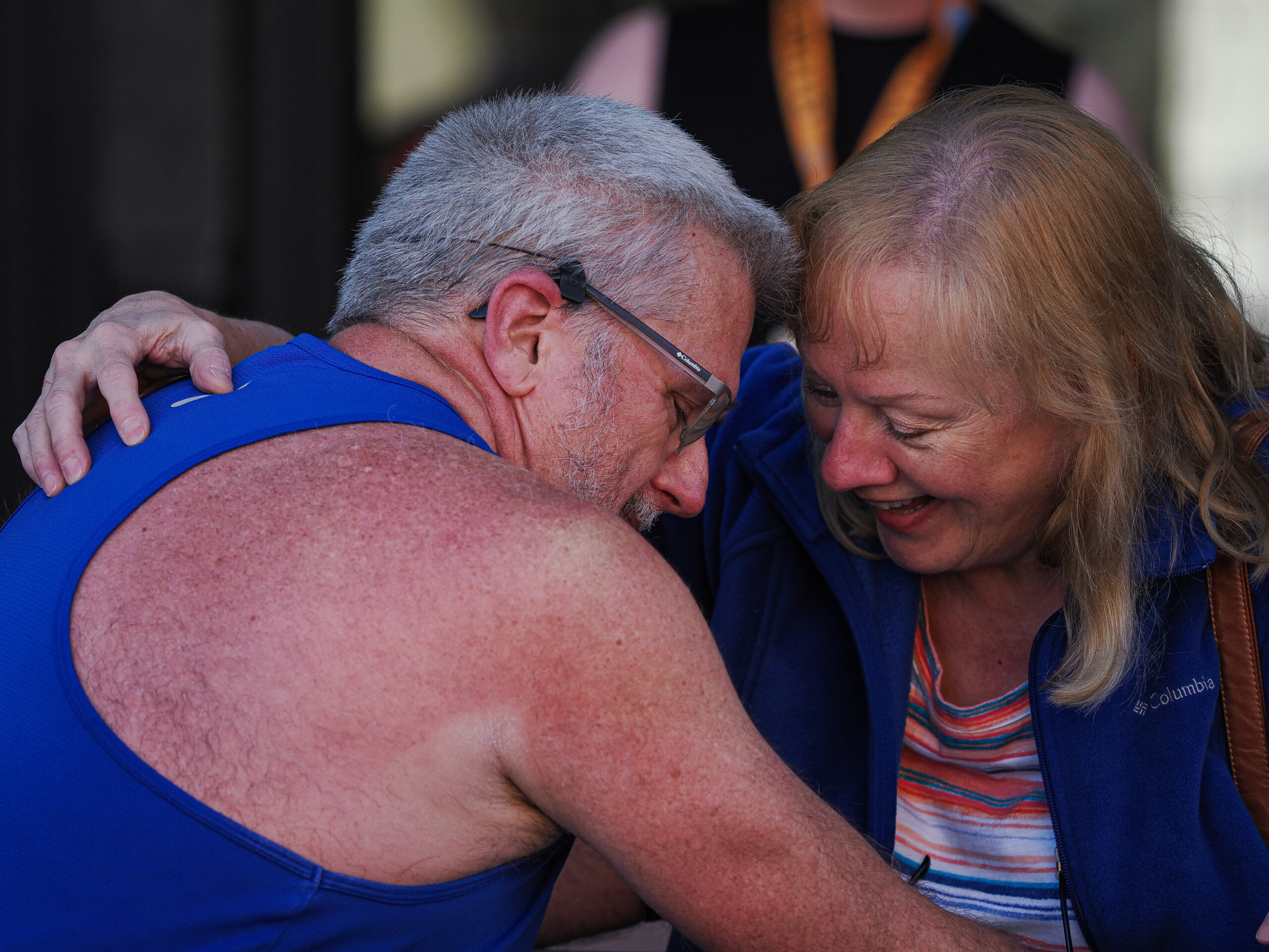 Max Bettner gets a hug from his wife Renita after completing the half marathon portion of the Mill Race Marathon in downtown Columbus, Ind., Sept. 27, 2025. This was Bettner’s 12th time running the half marathon portion of the race.