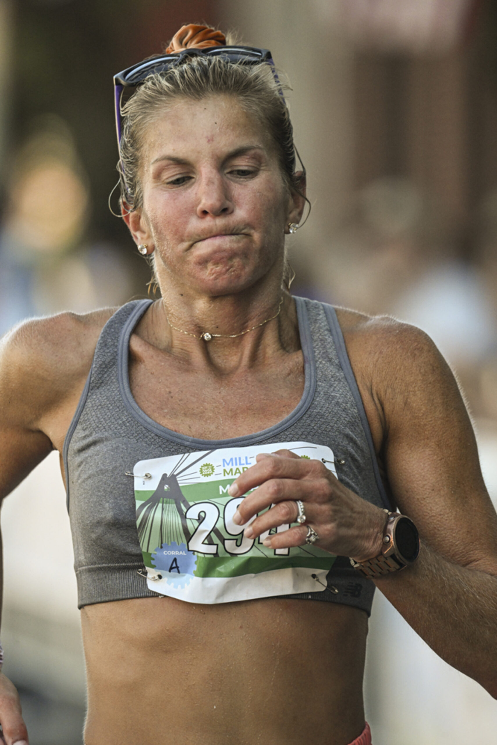 2025 Mill Race Marathon, Half Marathon Women’s winner, Tera Moody pushes to the start/finish line.