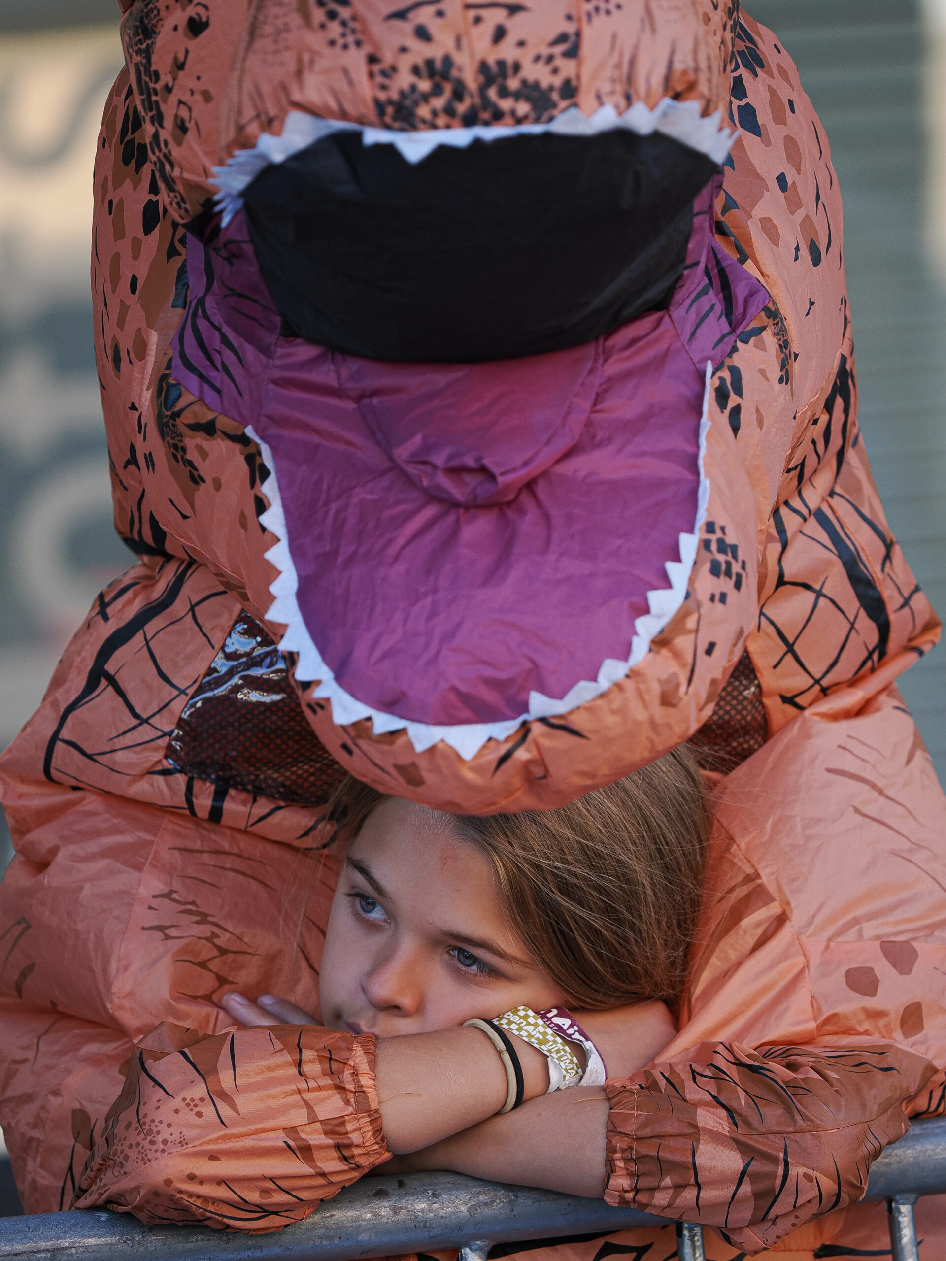 Lilly Schoentrup wears an inflatable dinosaur costume as she watches runners cross the finish line during the Mill Race Marathon in downtown Columbus, Ind., Sept. 27, 2025.