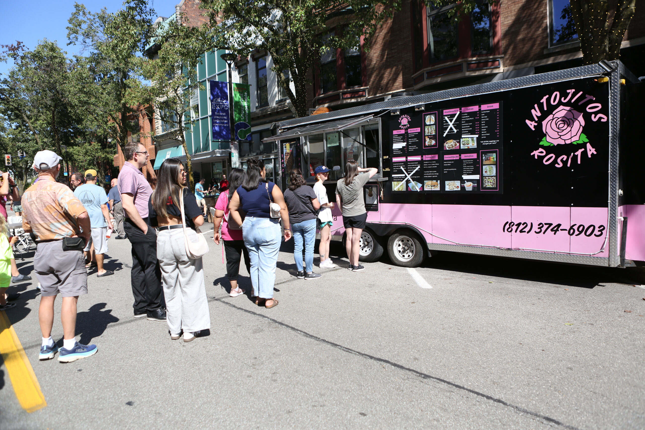 People line up for food at Antojitos Rosita food truck at Finish on 4th during the Mill Race Marathon, Columbus, Ind., Saturday, September 27, 2025.
