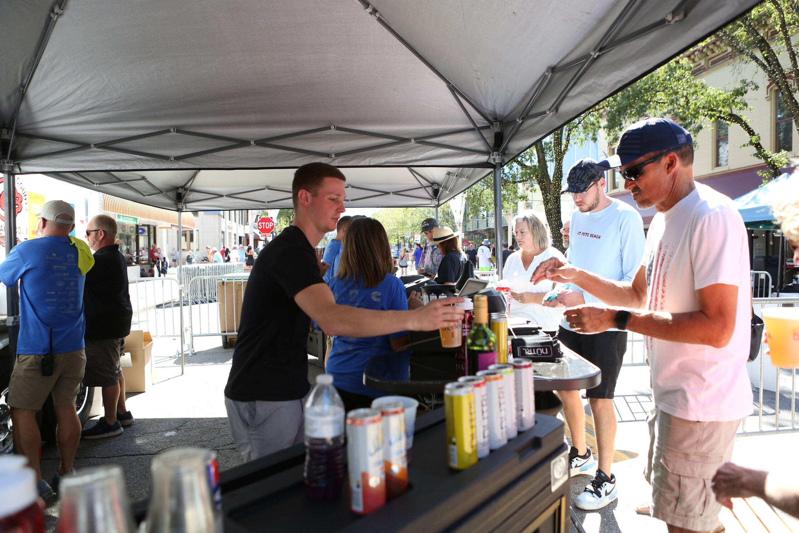 Tucker Schwarze, at left, serves beer at the 4th Street booth at Finish on 4th during the Mill Race Marathon, Columbus, Ind., Saturday, September 27, 2025.