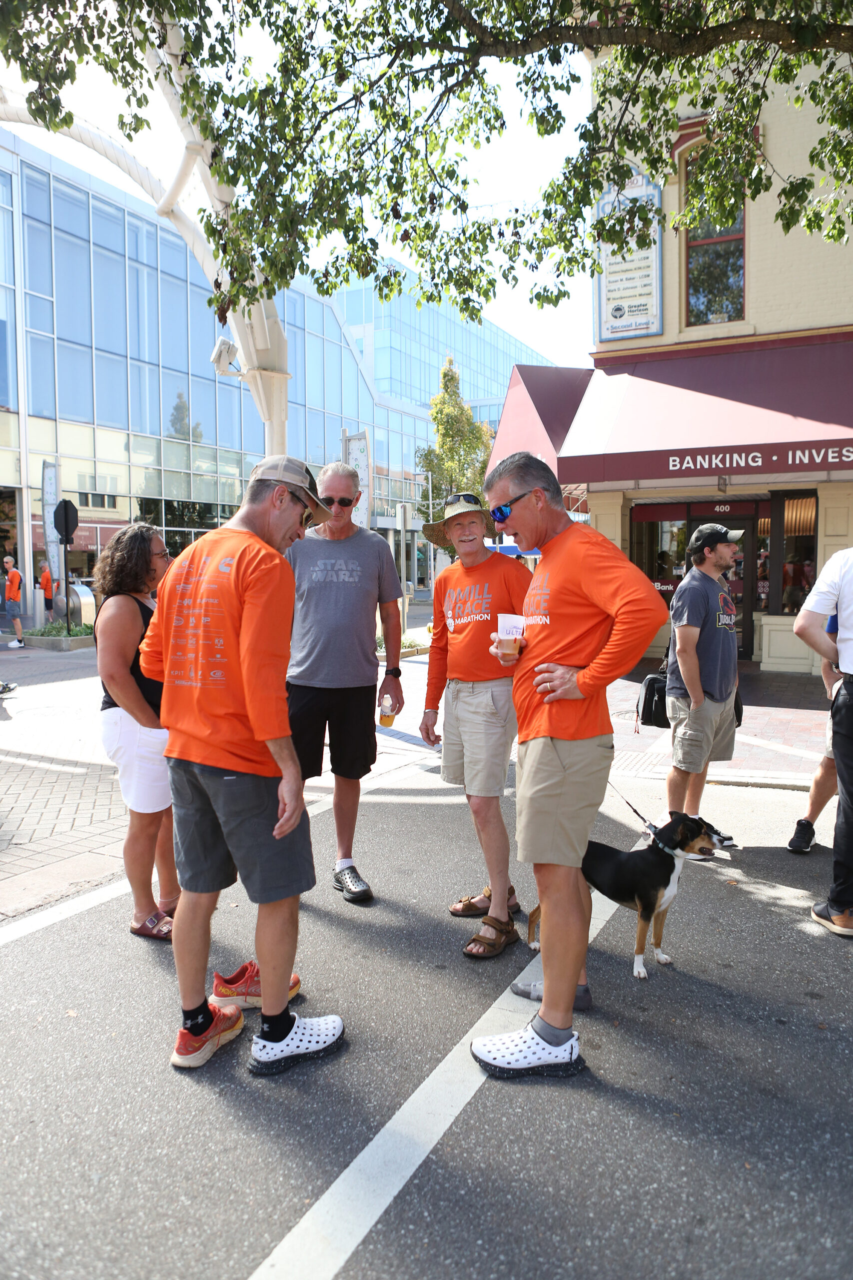 People visit at Finish on 4th during the Mill Race Marathon, Columbus, Ind., Saturday, September 27, 2025.