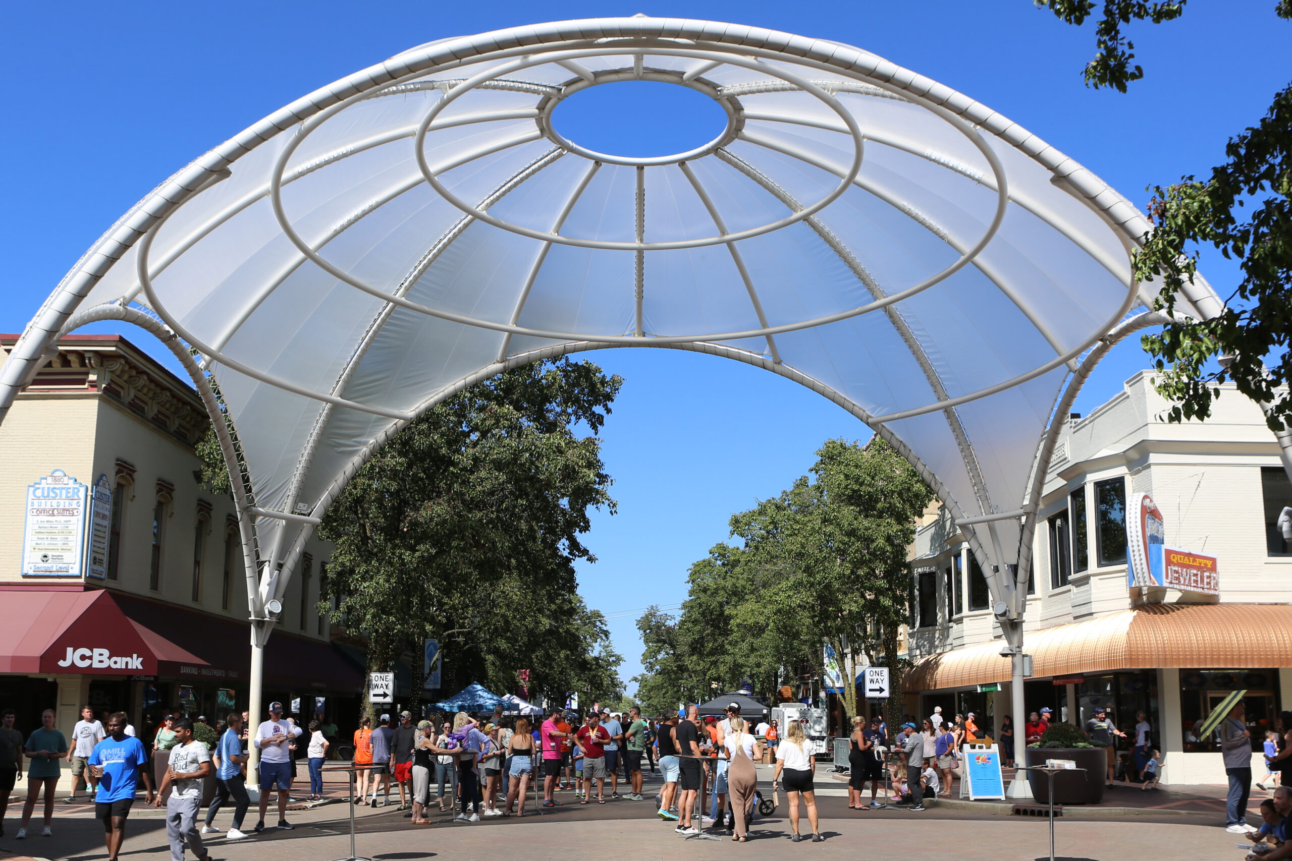 People gather under InterOculus at Finish on 4th during the Mill Race Marathon, Columbus, Ind., Saturday, September 27, 2025.
