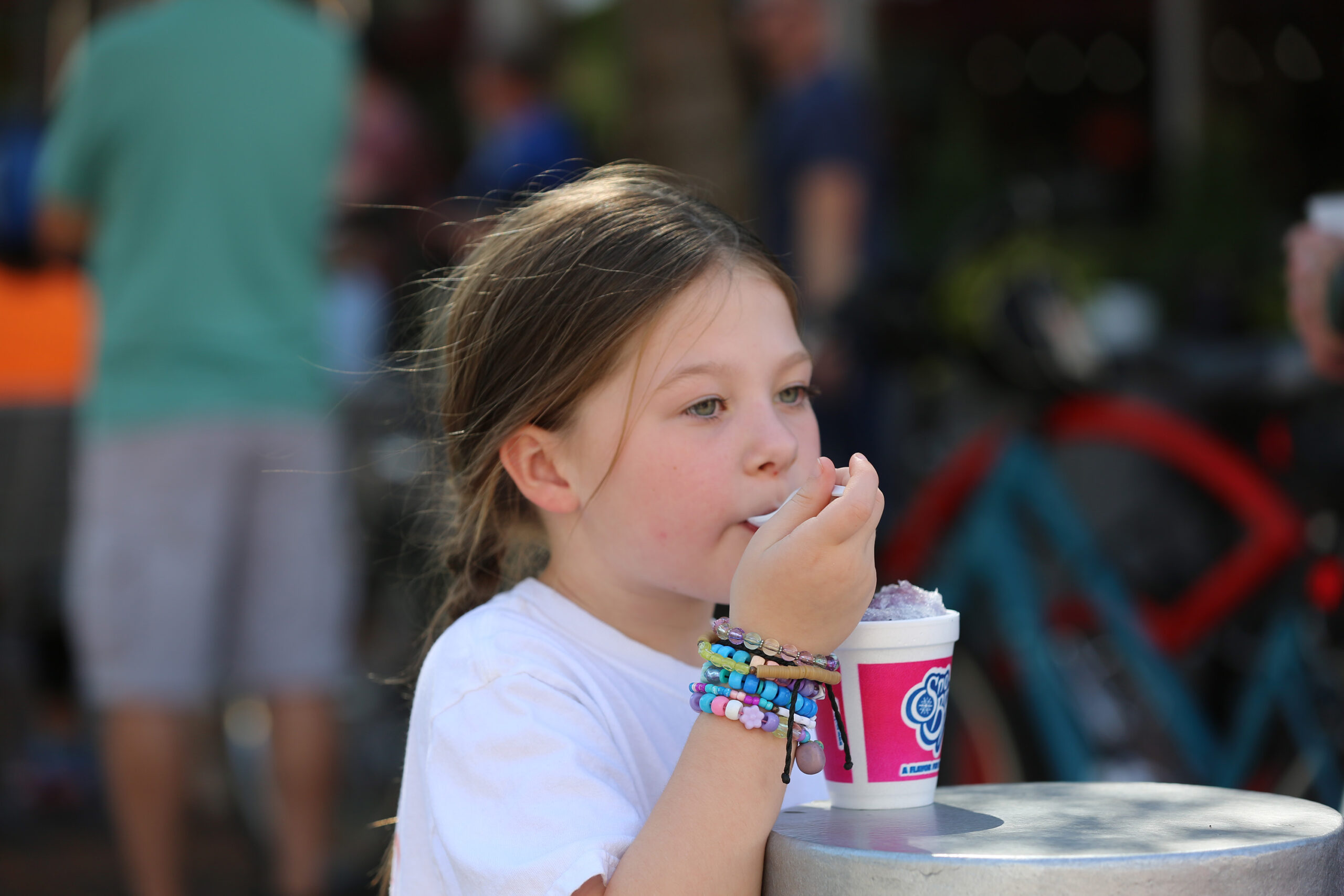 Lucy Riche enjoys a Sno Biz frozen treat at Finish on 4th during the Mill Race Marathon, Columbus, Ind., Saturday, September 27, 2025.