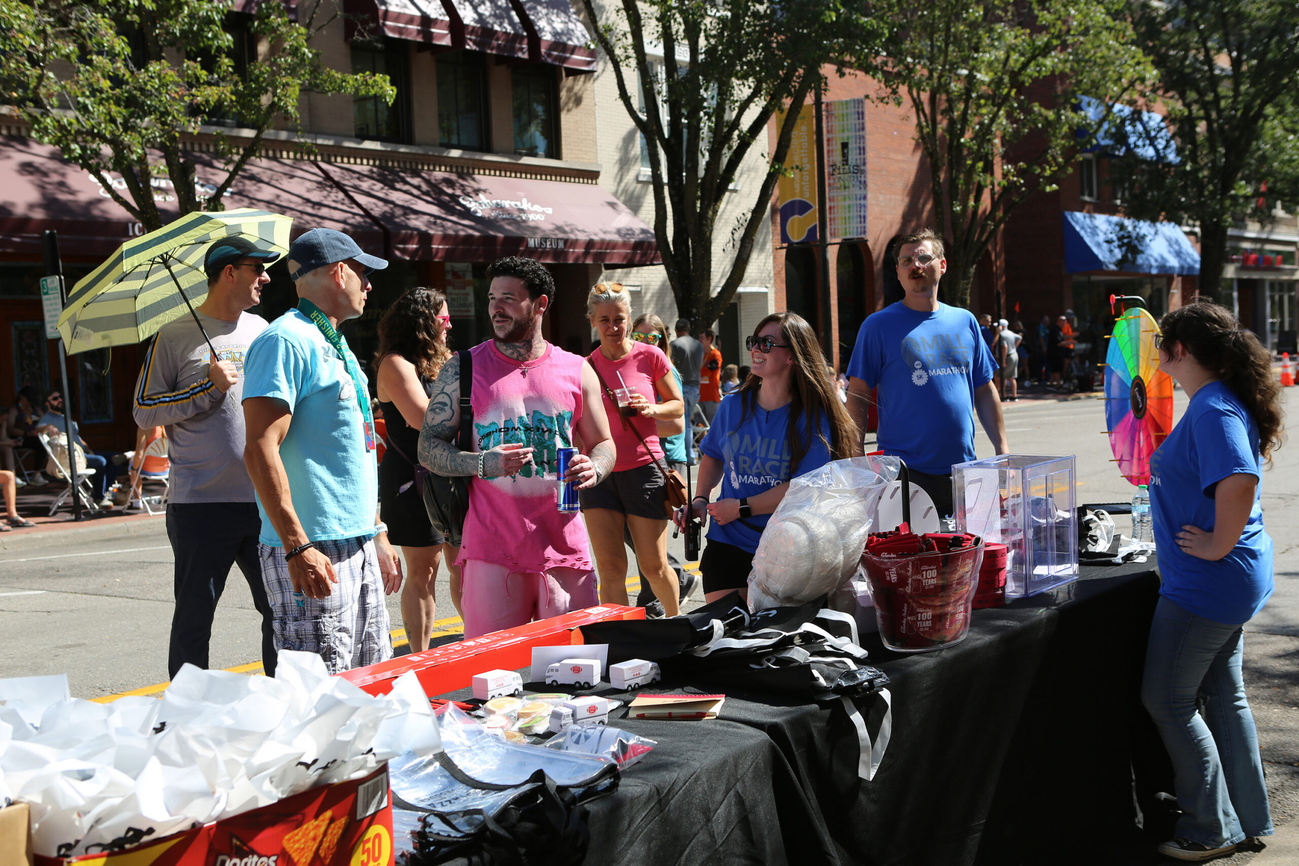 Table full of prizes provided by 4th Street Bar and Bartholomew County Beverage to be given away at Finish on 4th during the Mill Race Marathon, Columbus, Ind., Saturday, September 27, 2025.