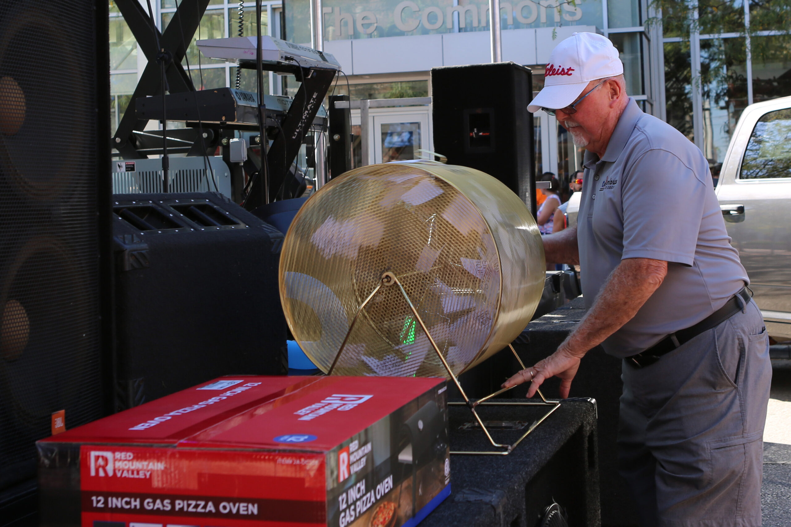 Fred Armstrong spins the drum in preparation for the drawing to give away a Dodge Ram truck courtesy of Chrysler Dodge Jeep Ram of Columbus at Finish on 4th during the Mill Race Marathon, Columbus, Ind., Saturday, September 27, 2025.